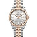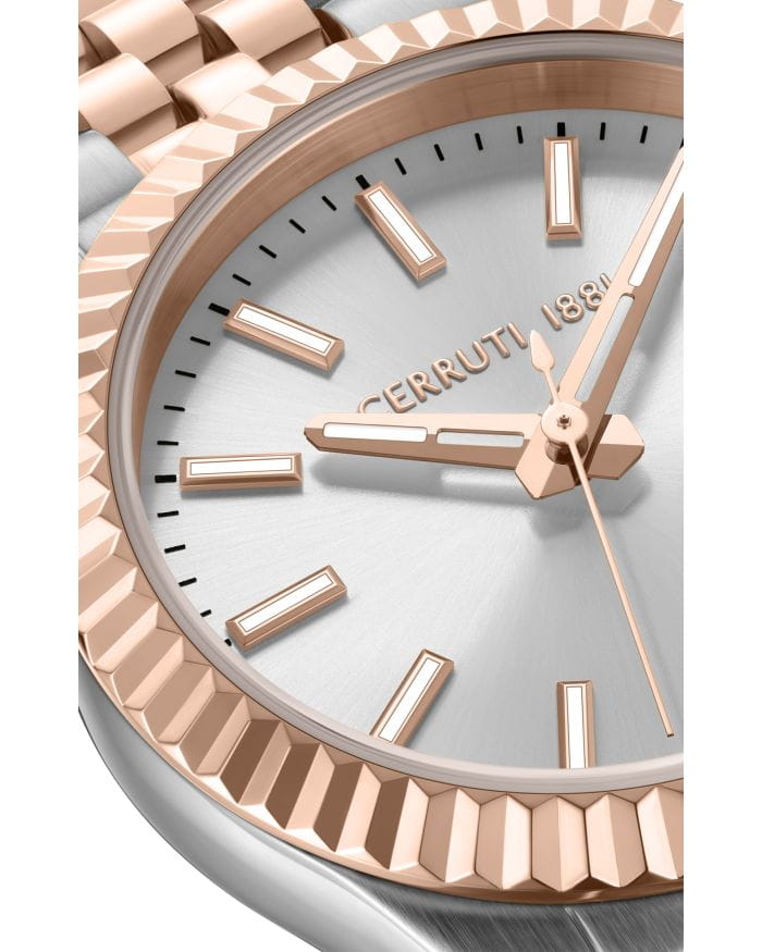 Женские кварцевые часы Cerruti 1881 Chienti CIWLH0084202 — изысканный французский аксессуар с золотистыми акцентами и функцией даты. Корпус из нержавеющей стали 316L. БезельБезельВнешний ободок, закрепляющий стекло. В спортивных часах так называется поворотное кольцо с делениями на циферблате, выполняет роль таймера – замеряет отрезки времени на шкале. Неподвижный безель – элемент декора. Однонаправленно вращающийся безель на дайверских часах позволяет фиксировать моменты погружения и выныривания на поверхность. с частичным PVD-покрытиемPVDУльтратонкое покрытие наносится в технике вакуумного напыления, сочетает в себе нитрид титана особой прочности со слоем золота или оксида хрома. Несёт в себе декоративную или защитную функцию. золотистого цвета, размером 31 мм. Циферблат — серебристый с штриховыми метками. Окошко даты в положении 3 часов. Стекло — минеральноеМинеральное стеклоМинеральное стекло представляет собой искусственно выращенный минерал кварца. Такое стекло отличается особой устойчивостью к повреждениям и царапинам. Уступает по некоторым качествам сапфировому стеклу. с сапфировым покрытием. Стрелки и метки с люминесцентным покрытиемЛюминесцентное покрытиеПозволяет считывать показания времени в темноте. Производители наносят на стрелки, часовые индексы, безель или поверхность циферблата светонакопительный состав, дающий холодное свечение.. Браслет — стальной с частичным PVD-покрытиемPVDУльтратонкое покрытие наносится в технике вакуумного напыления, сочетает в себе нитрид титана особой прочности со слоем золота или оксида хрома. Несёт в себе декоративную или защитную функцию. на застёжке «бабочка» с кнопкамиЗастёжка "бабочка"Такой вид застёжки дополняется предохранителями, помогающими избежать случайного раскрытия браслета. Обладают изящным исполнением. . Водонепроницаемость 50 м. Идеальный выбор для тех, кто ценит французский дизайн и повседневную элегантность.