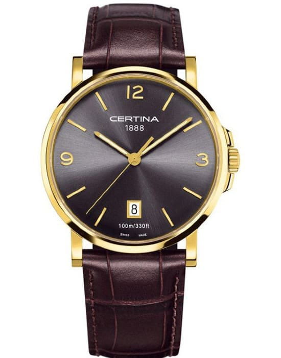 Наручные часы добавят элегантности в деловой или повседневный образ, лаконичность никогда не утратит актуальности. Аксессуар основан на концепции Двойной Защиты DS ConceptDS ConceptDouble Security Concept, обозначает двойную надёжность и безупречную точность часов Certina. Двойная система защиты подразумевает обеспечение максимальной устойчивости к ударам и высоких показателей водонепроницаемости., что позволяет ему стойко переносить любые условия. Швейцарский кварцевый калибр ETA F06.111 с высокой точностью хода. Надёжный корпус из стали 316L с противокоррозионными свойствами и золотистым PVD-покрытиемPVDУльтратонкое покрытие наносится в технике вакуумного напыления, сочетает в себе нитрид титана особой прочности со слоем золота или оксида хрома. Несёт в себе декоративную или защитную функцию.. Ремешок из натуральной кожи, поверхность которого сделана под рисунок кожи крокодила. Стекло из сапфира не допускает появления царапин. Стрелки с люминесцентным покрытиемЛюминесцентное покрытиеПозволяет считывать показания времени в темноте. Производители наносят на стрелки, часовые индексы, безель или поверхность циферблата светонакопительный состав, дающий холодное свечение.. Водозащита 100 метров. Апертура даты, индикатор EOLEOLПредставляет собой систему, уведомляющую владельца часов о необходимости замены элемента питания. За 2 недели до полного разряда батарейки секундная стрелка перестаёт ходить чётко и начинает перепрыгивать на 3-4 деления.. Диаметр корпуса: 38 мм.
