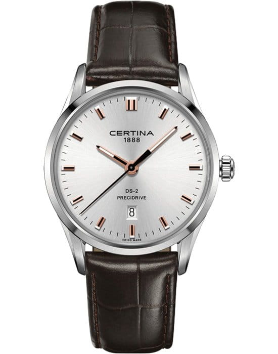 Узор «солнечные лучи», аккуратные накладные метки, изящные стрелки и лаконичные надписи – часы не имеют лишних элементов. Ремешок из натуральной телячьей кожи с тиснением «под аллигатора» останется актуальным в любые времена. Швейцарский кварцевый механизм ETA F06.411 Precidrive™Precidrive™Инновационный кварцевый механизм Certina. Часы, оснащённые этим швейцарским калибром, приравниваются к точности к сертифицированным хронометрам, точность хода составляет +/-10 секунд в год.. Удароустойчивый корпусУдаропрочный корпусМеханизм заключён в корпус, выполненный из современных материалов, устойчивых к ударам, механическим повреждениям и падению с высоты: инновационный пластик, карбон, нержавеющая сталь, титан. из хирургической стали. Люминесцентная подсветкаЛюминесцентное покрытиеПозволяет считывать показания времени в темноте. Производители наносят на стрелки, часовые индексы, безель или поверхность циферблата светонакопительный состав, дающий холодное свечение.. Концепция Double SecurityDS ConceptDouble Security Concept, обозначает двойную надёжность и безупречную точность часов Certina. Двойная система защиты подразумевает обеспечение максимальной устойчивости к ударам и высоких показателей водонепроницаемости.. Антибликовая обработка стекла из сапфира. Водонепроницаемость WR 100. . Апертура даты, функция EOLEOLПредставляет собой систему, уведомляющую владельца часов о необходимости замены элемента питания. За 2 недели до полного разряда батарейки секундная стрелка перестаёт ходить чётко и начинает перепрыгивать на 3-4 деления.. Диаметр корпуса: 40 мм.
