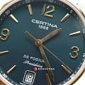 Модель с изысканной формой корпуса умело комбинирует элегантность и спортивный стиль, претворяя в жизнь универсальные часы для делового, повседневного или вечернего наряда. Они оснащены кварцевым швейцарским калибром ETA F03.411 Precidrive™Precidrive™Инновационный кварцевый механизм Certina. Часы, оснащённые этим швейцарским калибром, приравниваются к точности к сертифицированным хронометрам, точность хода составляет +/-10 секунд в год., обеспечивающим абсолютную точность показателей. Сапфировое стекло с односторонним антибликовым покрытием защищает ярко-зелёный циферблат. Водостойкость 100 метров. Концепция DS ConceptDS ConceptDouble Security Concept, обозначает двойную надёжность и безупречную точность часов Certina. Двойная система защиты подразумевает обеспечение максимальной устойчивости к ударам и высоких показателей водонепроницаемости.. Нержавеющая сталь с частичным PVD-покрытиемPVDУльтратонкое покрытие наносится в технике вакуумного напыления, сочетает в себе нитрид титана особой прочности со слоем золота или оксида хрома. Несёт в себе декоративную или защитную функцию. цвета розового золота. . Апертура даты, функция EOLEOLПредставляет собой систему, уведомляющую владельца часов о необходимости замены элемента питания. За 2 недели до полного разряда батарейки секундная стрелка перестаёт ходить чётко и начинает перепрыгивать на 3-4 деления.. Диаметр корпуса: 33 мм.
