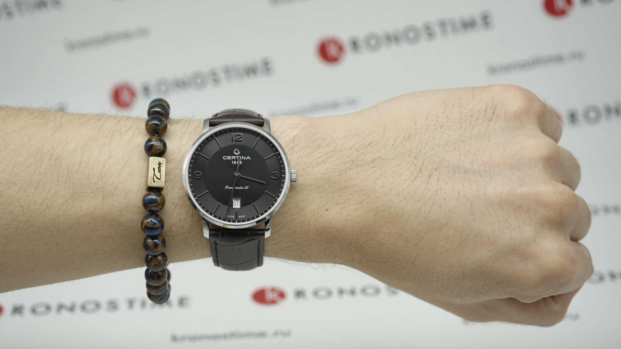 Модель выполнена в классическом стиле, благодаря чему она сохраняет актуальность во все времена. Цифру 6 заменяет прямоугольное окошко индикации текущего числа. Часы заводятся от движений руки носителя, швейцарский механизм ETA Powermatic 80Powermatic 80Эксклюзивный калибр от швейцарской компании ETA с увеличенным запасом хода до 80 часов за счёт удлинённой заводной пружины. Характеризуется улучшенной системой спуска со сниженным трением. сохраняет запас хода до 80-часов. Прозрачная задняя крышка. Сапфировое стекло. Стальной корпус с реализацией концепции DS ConceptDS ConceptDouble Security Concept, обозначает двойную надёжность и безупречную точность часов Certina. Двойная система защиты подразумевает обеспечение максимальной устойчивости к ударам и высоких показателей водонепроницаемости.. Ремешок из натуральной кожи. Водонепроницаемость 10 бар. Диаметр корпуса: 39 мм.