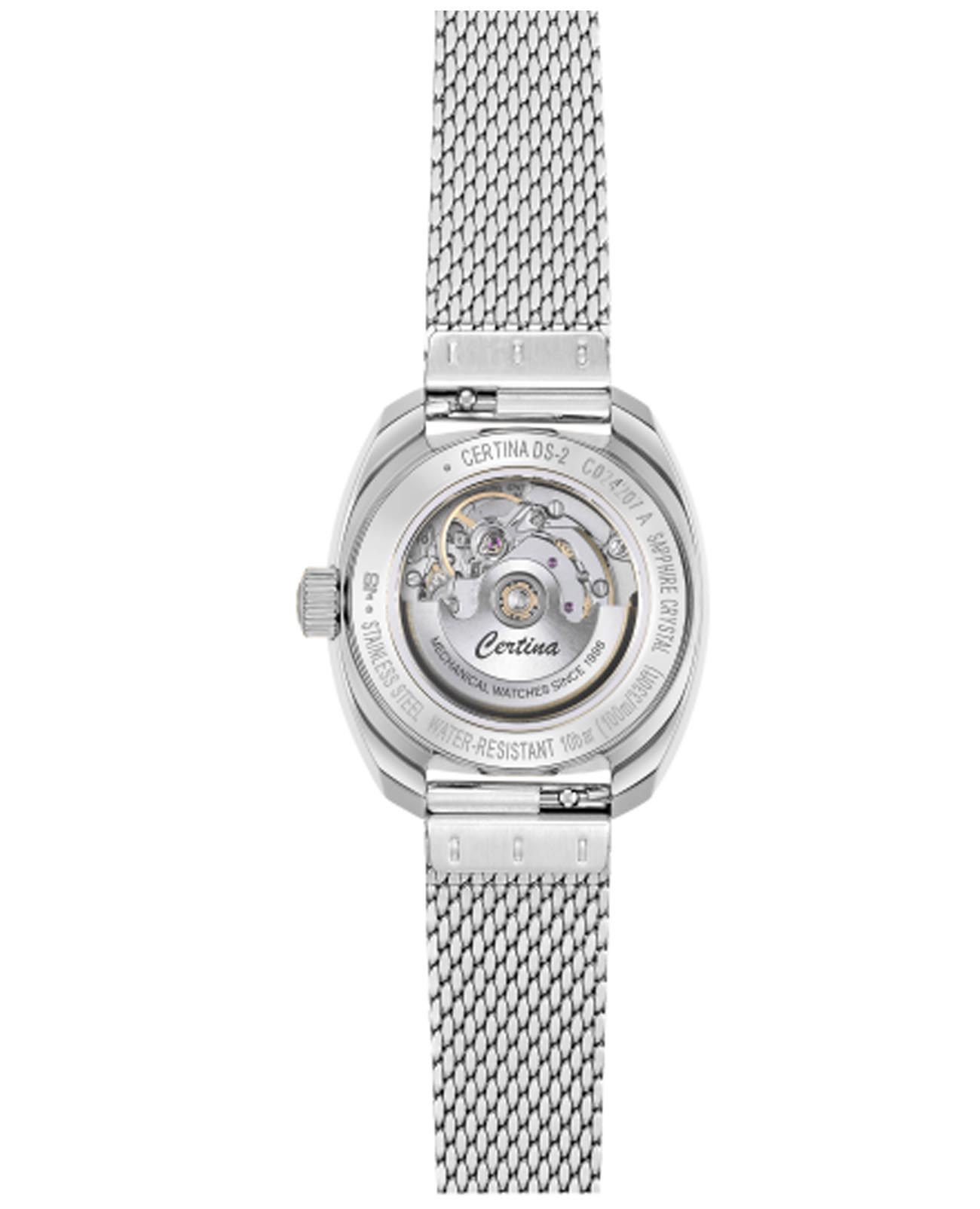 Женские швейцарские механические часы с автоподзаводом Certina DS-2 C0242071111100. Сапфировое стеклоСапфировое стеклоПрочный и надёжный материал из кристалла сапфира синтетического происхождения, характеризующийся особой твёрдостью и устойчивостью к царапинам и повреждениям. устойчивое к появлению царапин, обладающее высокой прозрачностью. Корпус изготовлен из нержавеющей стали. Стрелки с люминесцентным покрытиемЛюминесцентное покрытиеПозволяет считывать показания времени в темноте. Производители наносят на стрелки, часовые индексы, безель или поверхность циферблата светонакопительный состав, дающий холодное свечение. Superluminova. Окошко даты находится в положении 3 часа. Класс водозащиты: 100 метров, позволит плавать, нырять и заниматься другими водными видами спорта. Стальной браслет с частичным миланским плетением на застёжке-бабочке с кнопкамиЗастёжка "бабочка"Такой вид застёжки дополняется предохранителями, помогающими избежать случайного раскрытия браслета. Обладают изящным исполнением. .