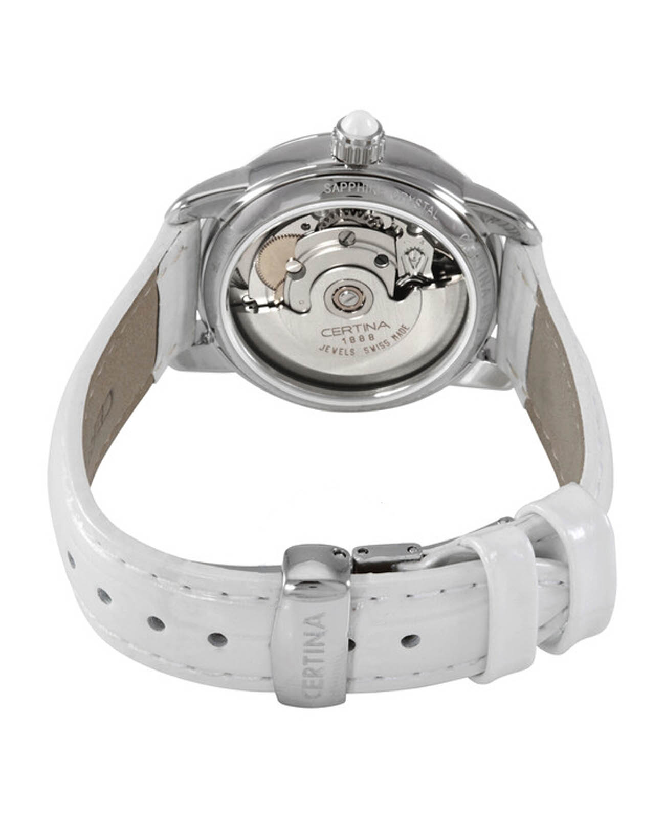 Женские швейцарские механические часы с автоподзаводом Certina DS Podium C0252071603700. Сапфировое стеклоСапфировое стеклоПрочный и надёжный материал из кристалла сапфира синтетического происхождения, характеризующийся особой твёрдостью и устойчивостью к царапинам и повреждениям. устойчивое к появлению царапин, обладающее высокой прозрачностью. Корпус изготовлен из нержавеющей стали. Стрелки с люминесцентным покрытиемЛюминесцентное покрытиеПозволяет считывать показания времени в темноте. Производители наносят на стрелки, часовые индексы, безель или поверхность циферблата светонакопительный состав, дающий холодное свечение.. Окошко даты находится в положении 6 часов. Класс водозащиты: 100 метров, позволит плавать, нырять и заниматься другими водными видами спорта. Кожаный ремешок на стандартной застежке.