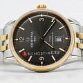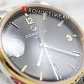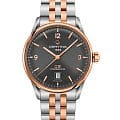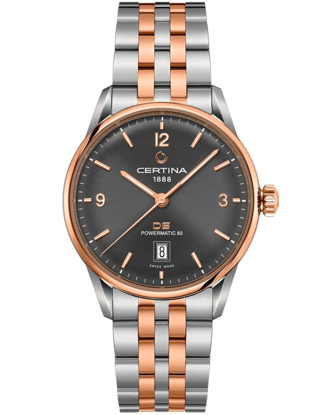 Антрацитовый циферблат дополнен стрелками и метками в золотистом цвете. Контрастное исполнение позволяет легко считывать показатели даже при мимолётном взгляде. Стильно смотрится сочетание блеска нержавеющей стали 316L и оттенок розового золота PVD-покрытияPVDУльтратонкое покрытие наносится в технике вакуумного напыления, сочетает в себе нитрид титана особой прочности со слоем золота или оксида хрома. Несёт в себе декоративную или защитную функцию.. Часы с автоподзаводом комплектуются швейцарским механизмом ETA Powermatic 80Powermatic 80Эксклюзивный калибр от швейцарской компании ETA с увеличенным запасом хода до 80 часов за счёт удлинённой заводной пружины. Характеризуется улучшенной системой спуска со сниженным трением., имеющим увеличенный резерв хода до 80 часов. Прозрачная задняя крышка – идеальный вариант для любителей прикоснуться к искусству часового мастерства. Сапфировое стекло дополнено антибликовым покрытием. В основе конструкции часов лежит концепция DSDS ConceptDouble Security Concept, обозначает двойную надёжность и безупречную точность часов Certina. Двойная система защиты подразумевает обеспечение максимальной устойчивости к ударам и высоких показателей водонепроницаемости., что гарантирует ударопрочность модели. В нижней части циферблата расположено окошко даты. Диаметр корпуса: 40 мм.