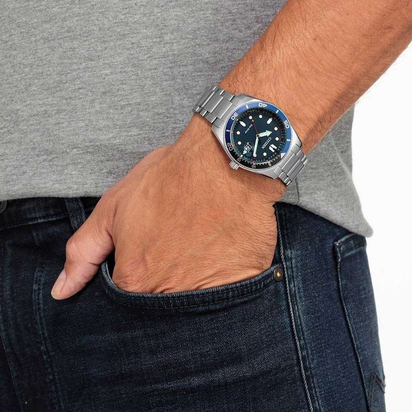 Часы Citizen AW1761-89L произведены в Японии и представляют собой гармоничное сочетание спортивного стиля и современных технологий. Модель оснащена кварцевым механизмом с калибром Citizen J810 и уникальной системой Eco-Drive Aqua Matic, которая позволяет заряжать часы от солнечного света и не требует замены батарейки, обеспечивая запас хода до 240 дней. Прочный корпус диаметром 43 мм выполнен из нержавеющей стали, а на вращающийся безельБезельВнешний ободок, закрепляющий стекло. В спортивных часах так называется поворотное кольцо с делениями на циферблате, выполняет роль таймера – замеряет отрезки времени на шкале. Неподвижный безель – элемент декора. Однонаправленно вращающийся безель на дайверских часах позволяет фиксировать моменты погружения и выныривания на поверхность. нанесено синее и черное IP-покрытиеIP-покрытиеМетод ионного напыления. Демонстрирует повышенную устойчивость к истиранию, окислению и химическим веществам. Под воздействием высокого давления и температуры около 1500°C молекулы металла надёжно соединяются с частицами корпуса часов., что придает модели выразительный внешний вид и надежную защиту от внешних воздействий. Эффектный синий циферблат оформлен метками в виде штрихов и точек, а также оснащен стрелками и метками с люминесцентным покрытиемЛюминесцентное покрытиеПозволяет считывать показания времени в темноте. Производители наносят на стрелки, часовые индексы, безель или поверхность циферблата светонакопительный состав, дающий холодное свечение. для удобства считывания времени даже в темноте. Окошко даты с увеличительным стеклом расположено на циферблате, что делает показания особенно читаемыми. выпуклое минеральное стеклоМинеральное стеклоМинеральное стекло представляет собой искусственно выращенный минерал кварца. Такое стекло отличается особой устойчивостью к повреждениям и царапинам. Уступает по некоторым качествам сапфировому стеклу. защищает часы от случайных повреждений, а водозащита 100WR позволяет использовать их в повседневной жизни и во время активного отдыха. Удобный стальной браслет с раскладной застёжкойРаскладная застёжкаТакой тип застёжки используется только на браслетах из металла. Она никогда не раскрывается полностью, происходит разделение на 2 и более частей. Раскладывающая застёжка снизит вероятность потери часов к минимуму. обеспечивает комфортное ношение и надежную фиксацию на запястье. Толщина корпуса составляет 11,7 мм, что делает часы практичным и стильным аксессуаром для каждого дня.