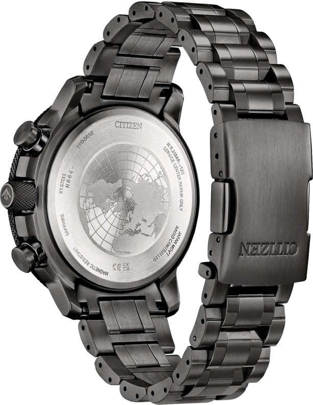 Мужские часы Citizen Promaster Geo Trekker BY3005-56G спортивного дизайна с высоким уровнем водозащиты. Корпус из нержавеющей стали с IP-покрытиемIP-покрытиеМетод ионного напыления. Демонстрирует повышенную устойчивость к истиранию, окислению и химическим веществам. Под воздействием высокого давления и температуры около 1500°C молекулы металла надёжно соединяются с частицами корпуса часов. диаметром 46 мм идеально сбалансирован. Сапфировое стеклоСапфировое стеклоПрочный и надёжный материал из кристалла сапфира синтетического происхождения, характеризующийся особой твёрдостью и устойчивостью к царапинам и повреждениям. с антибликовым покрытием обеспечивает отличную защиту циферблата от царапин. Часы работают на основе кварцевого механизма, питание от солнечной энергии, запас энергии на 180 дней. Стальной браслет на раскладной застёжкеРаскладная застёжкаТакой тип застёжки используется только на браслетах из металла. Она никогда не раскрывается полностью, происходит разделение на 2 и более частей. Раскладывающая застёжка снизит вероятность потери часов к минимуму. идеально дополняют дизайн часов, обеспечивая комфортное ношение. Стрелки и метки на циферблате имеют люминесцентное покрытиеЛюминесцентное покрытиеПозволяет считывать показания времени в темноте. Производители наносят на стрелки, часовые индексы, безель или поверхность циферблата светонакопительный состав, дающий холодное свечение. позволяющее легко определять время даже в темноте. Вращающийся безельБезельВнешний ободок, закрепляющий стекло. В спортивных часах так называется поворотное кольцо с делениями на циферблате, выполняет роль таймера – замеряет отрезки времени на шкале. Неподвижный безель – элемент декора. Однонаправленно вращающийся безель на дайверских часах позволяет фиксировать моменты погружения и выныривания на поверхность. с логарифмической линейкой. Функция индикации заряда (EOL) и предотвращения перезарядки. Защищены от магнитных полей. Автоматический прием сигналов от радиовышек, расположенных в различных точках земного шара, которые передают временные сигналы от определенных атомных часов. Коррекция текущего времени радиосигналом на территории почти всей Европы, США, Японии и Китая. Мировое времяМировое время Полезное часовое усложнение, отображающее время в основных городах и известных областях по всему миру, оно связано с часовыми поясами, удобно для путешественников и бизнесменов. - 26 городов, переход на зимнее и летнее время. Отображение мирового времени для Северного полушария вынесено на отдельный циферблат, который вращается против часовой стрелки и находится в положении 6 часов. Окошко даты находится в положении 4 часа. Часы обладают впечатляющей водонепроницаемостью до 200WR, что делает их идеальными для плавания, ныряния и погружений с аквалангом.