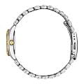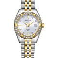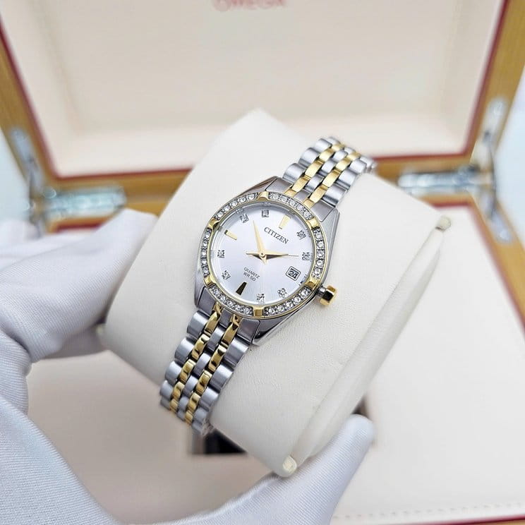 Элегантные часы Citizen EU6066-59A сочетают в себе изысканный дизайн и надежность японского качества. Круглый корпус диаметром 26 мм изготовлен из нержавеющей стали и украшен сверкающими кристаллами по безелюБезельВнешний ободок, закрепляющий стекло. В спортивных часах так называется поворотное кольцо с делениями на циферблате, выполняет роль таймера – замеряет отрезки времени на шкале. Неподвижный безель – элемент декора. Однонаправленно вращающийся безель на дайверских часах позволяет фиксировать моменты погружения и выныривания на поверхность. с PVD-покрытиемPVDУльтратонкое покрытие наносится в технике вакуумного напыления, сочетает в себе нитрид титана особой прочности со слоем золота или оксида хрома. Несёт в себе декоративную или защитную функцию. цвета желтого золота, что придает модели утонченный вид. Серебристый циферблат дополнен центральными стрелками и апертурой даты на позиции 3 часов. Минеральное стеклоМинеральное стеклоМинеральное стекло представляет собой искусственно выращенный минерал кварца. Такое стекло отличается особой устойчивостью к повреждениям и царапинам. Уступает по некоторым качествам сапфировому стеклу. защищает от мелких повреждений, а стальной браслет с частичным PVD-покрытиемPVDУльтратонкое покрытие наносится в технике вакуумного напыления, сочетает в себе нитрид титана особой прочности со слоем золота или оксида хрома. Несёт в себе декоративную или защитную функцию. цвета желтого золота и с раскладной застёжкойРаскладная застёжкаТакой тип застёжки используется только на браслетах из металла. Она никогда не раскрывается полностью, происходит разделение на 2 и более частей. Раскладывающая застёжка снизит вероятность потери часов к минимуму. обеспечивает комфортную посадку. Стрелки с люминесцентным покрытиемЛюминесцентное покрытиеПозволяет считывать показания времени в темноте. Производители наносят на стрелки, часовые индексы, безель или поверхность циферблата светонакопительный состав, дающий холодное свечение. для отличной читаемости в любое время суток. Благодаря водостойкости WR 50 часы подходят для повседневного ношения, включая мытье рук и дождь.