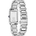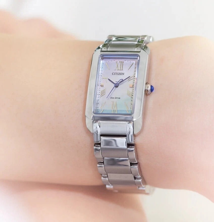 Изящные женские часы Citizen EW5620-55N сочетают в себе японское качество и современный дизайн. Корпус прямоугольной формы выполнен из прочной нержавеющей стали, а элегантный браслет оснащён удобной застежкой «бабочка»Застёжка "бабочка"Такой вид застёжки дополняется предохранителями, помогающими избежать случайного раскрытия браслета. Обладают изящным исполнением. . Перламутровый циферблат украшен римскими цифрами и изысканными синими стрелками. Модель оснащена надёжным кварцевым механизмом японского производства, защищена сапфировым стекломСапфировое стеклоПрочный и надёжный материал из кристалла сапфира синтетического происхождения, характеризующийся особой твёрдостью и устойчивостью к царапинам и повреждениям. и обладает водозащитой WR 50, что позволяет использовать часы во время плавания. Размеры корпуса — 19 мм в ширину, 32,5 мм в высоту и 7 мм в толщину. На изделие предоставляется гарантия сроком 1 год.