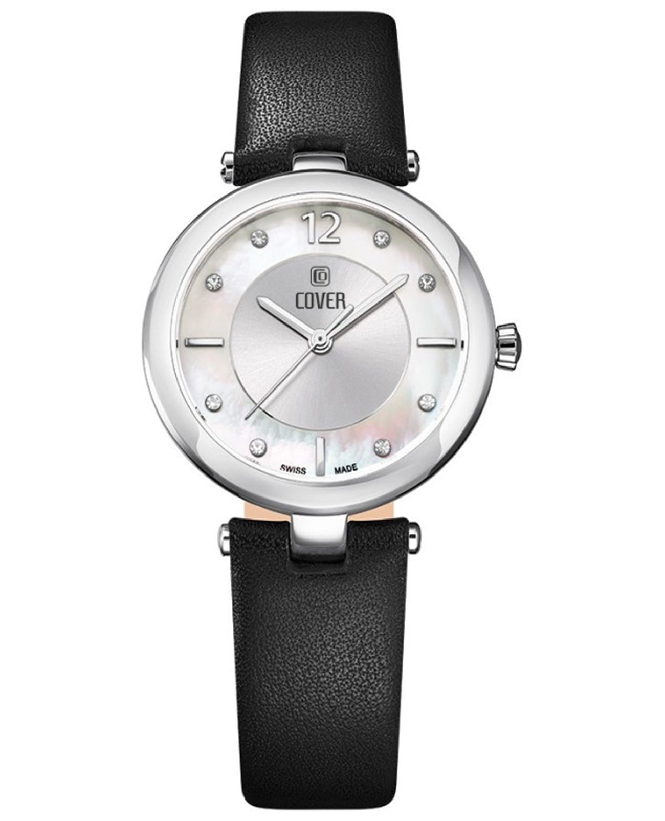 Женственные коктейльные часы COVER CO193.06 из коллекции Amelia работают на кварцевом калибре ETA. Циферблат имеет центральную область серебристого цвета с узором Sunray и белую перламутровую периферийную часть, которые защищены минеральным стекломМинеральное стеклоМинеральное стекло представляет собой искусственно выращенный минерал кварца. Такое стекло отличается особой устойчивостью к повреждениям и царапинам. Уступает по некоторым качествам сапфировому стеклу. с сапфировым напылением. В качестве часовых меток используются 8 кристаллов Swarovski, а также 3 накладных индекса и арабская цифра «12». Корпус из стали диаметром 32 мм с широким полированным безелемБезельВнешний ободок, закрепляющий стекло. В спортивных часах так называется поворотное кольцо с делениями на циферблате, выполняет роль таймера – замеряет отрезки времени на шкале. Неподвижный безель – элемент декора. Однонаправленно вращающийся безель на дайверских часах позволяет фиксировать моменты погружения и выныривания на поверхность.. Часы комплектуются черным кожаным ремешком на стандартной застёжке и имеют маркировку «Swiss Made».