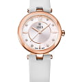 Женственные коктейльные часы COVER CO193.14 из коллекции Amelia работают на кварцевом калибре ETA. Циферблат имеет центральную область серебристого цвета с узором Sunray и белую перламутровую периферийную часть, которые защищены минеральным стекломМинеральное стеклоМинеральное стекло представляет собой искусственно выращенный минерал кварца. Такое стекло отличается особой устойчивостью к повреждениям и царапинам. Уступает по некоторым качествам сапфировому стеклу. с сапфировым напылением. В качестве часовых меток используются 8 кристаллов Swarovski, а также 3 накладных индекса и арабская цифра «12». Корпус 32 мм диаметром выполнен из нержавеющей стали с PVD-покрытиемPVDУльтратонкое покрытие наносится в технике вакуумного напыления, сочетает в себе нитрид титана особой прочности со слоем золота или оксида хрома. Несёт в себе декоративную или защитную функцию. цвета розового золота, с широким полированным безелемБезельВнешний ободок, закрепляющий стекло. В спортивных часах так называется поворотное кольцо с делениями на циферблате, выполняет роль таймера – замеряет отрезки времени на шкале. Неподвижный безель – элемент декора. Однонаправленно вращающийся безель на дайверских часах позволяет фиксировать моменты погружения и выныривания на поверхность.. Часы комплектуются белым кожаным ремешком на стандартной застёжке и имеют маркировку «Swiss Made».