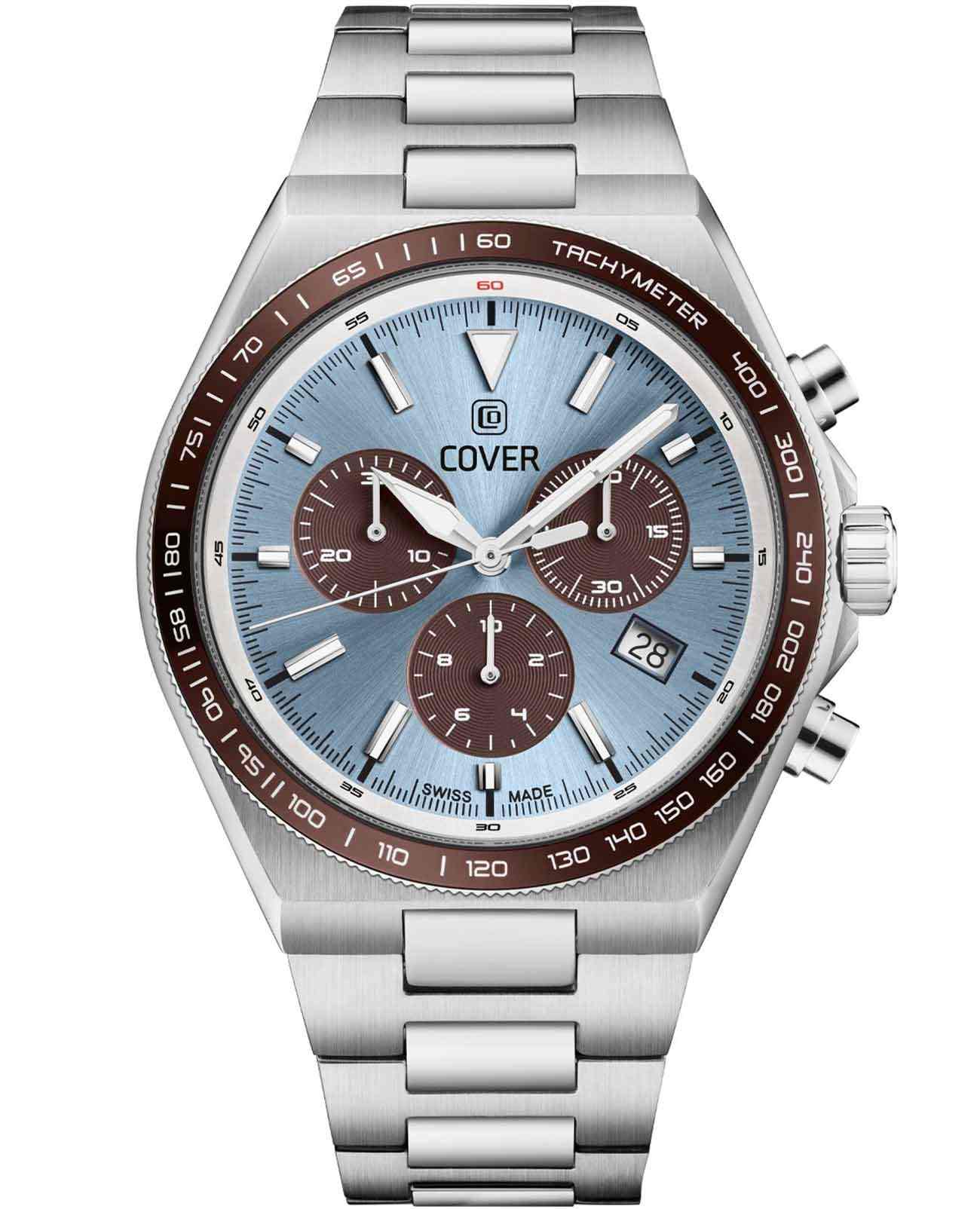 Мужские наручные часы-хронографХронографФункция позволяет измерять отрезки времени с особой точностью: часы, минуты, секунды. Верным признаком хронографа является наличие на циферблате 3 дополнительных окошек-счётчиков. Cover CO212.07 из коллекции Iconosteel сочетают в себе классический дизайн и надежность современных технологий. Часы оснащены кварцевым механизмом с модулем хронографа Ronda 5040.D, они обеспечивают точность и надежность в каждом моменте. Модель обладает круглым корпусом диаметром 41 мм, изготовленным из нержавеющей стали, что обеспечивает высокую устойчивость к внешним воздействиям. Браслет выполнен из нержавеющей стали с раскладной застёжкойРаскладная застёжкаТакой тип застёжки используется только на браслетах из металла. Она никогда не раскрывается полностью, происходит разделение на 2 и более частей. Раскладывающая застёжка снизит вероятность потери часов к минимуму., гарантирующей комфортное ношение и безопасность. Голубой циферблат оснащен окном даты на «4 часах» и стрелками с люминесцентным покрытиемЛюминесцентное покрытиеПозволяет считывать показания времени в темноте. Производители наносят на стрелки, часовые индексы, безель или поверхность циферблата светонакопительный состав, дающий холодное свечение.. Для защиты используется сапфировое стеклоСапфировое стеклоПрочный и надёжный материал из кристалла сапфира синтетического происхождения, характеризующийся особой твёрдостью и устойчивостью к царапинам и повреждениям., обеспечивающее прочную защиту от царапин и антибликовый эффект. На коричневый безельБезельВнешний ободок, закрепляющий стекло. В спортивных часах так называется поворотное кольцо с делениями на циферблате, выполняет роль таймера – замеряет отрезки времени на шкале. Неподвижный безель – элемент декора. Однонаправленно вращающийся безель на дайверских часах позволяет фиксировать моменты погружения и выныривания на поверхность. с PVD-покрытиемPVDУльтратонкое покрытие наносится в технике вакуумного напыления, сочетает в себе нитрид титана особой прочности со слоем золота или оксида хрома. Несёт в себе декоративную или защитную функцию. нанесена шкала тахиметраТахиметрРазмеченная шкала, располагается на ободке или безеле часов. Тахиметр позволяет рассчитать скорость на определённом участке пути, расстояние измеряется в километрах или милях.. Модель также является хронографом, оснащенным функцией секундомераСекундомерСекундоме́р — прибор, способный измерять интервалы времени с точностью до долей секунды., делая ее идеальной для активного образа жизни. Водонепроницаемость часов достигает 10 атмосфер (100 метров), что позволяет использовать их во время плавания и других водных видов спорта, однако не рекомендуется для глубоководного дайвинга.
