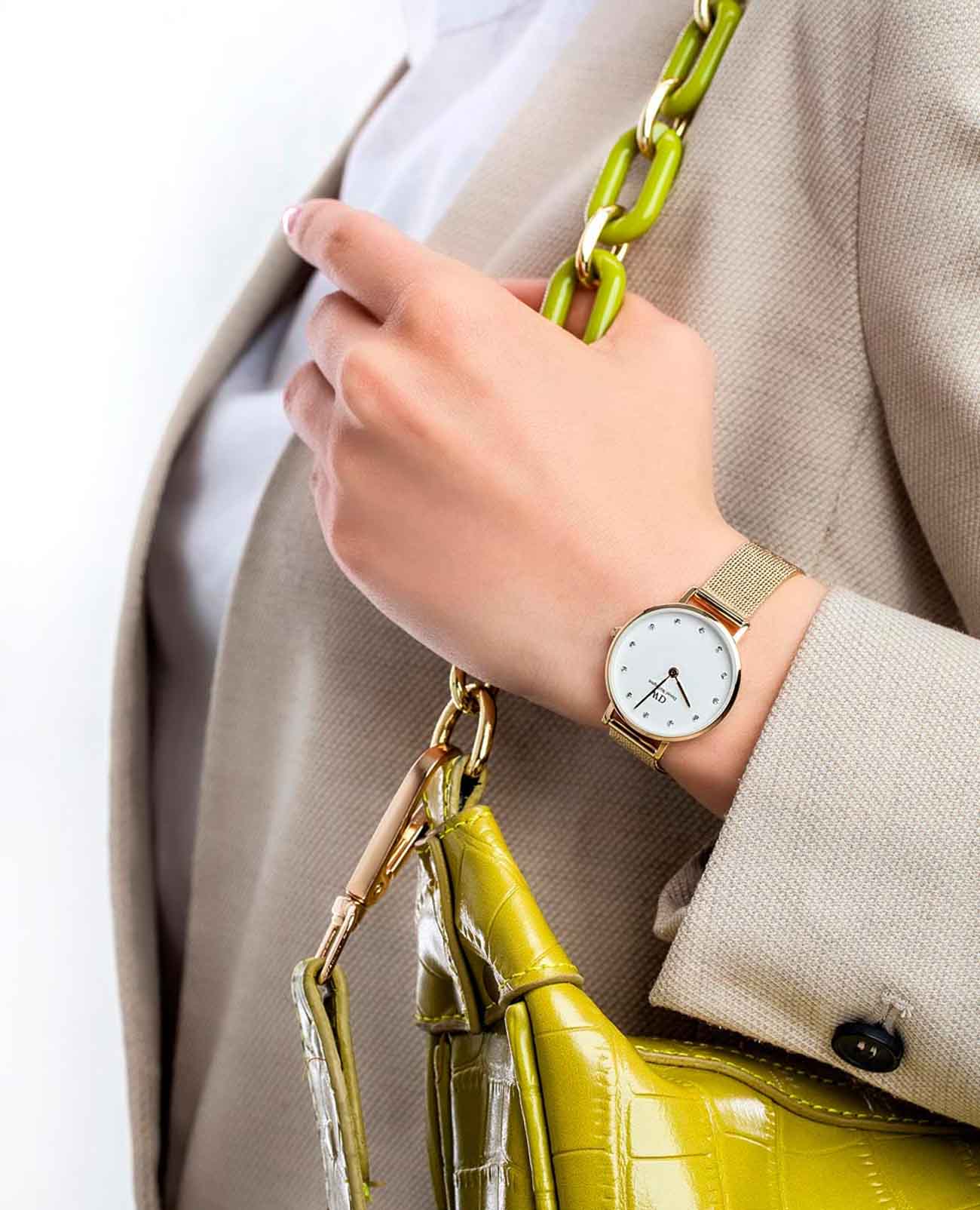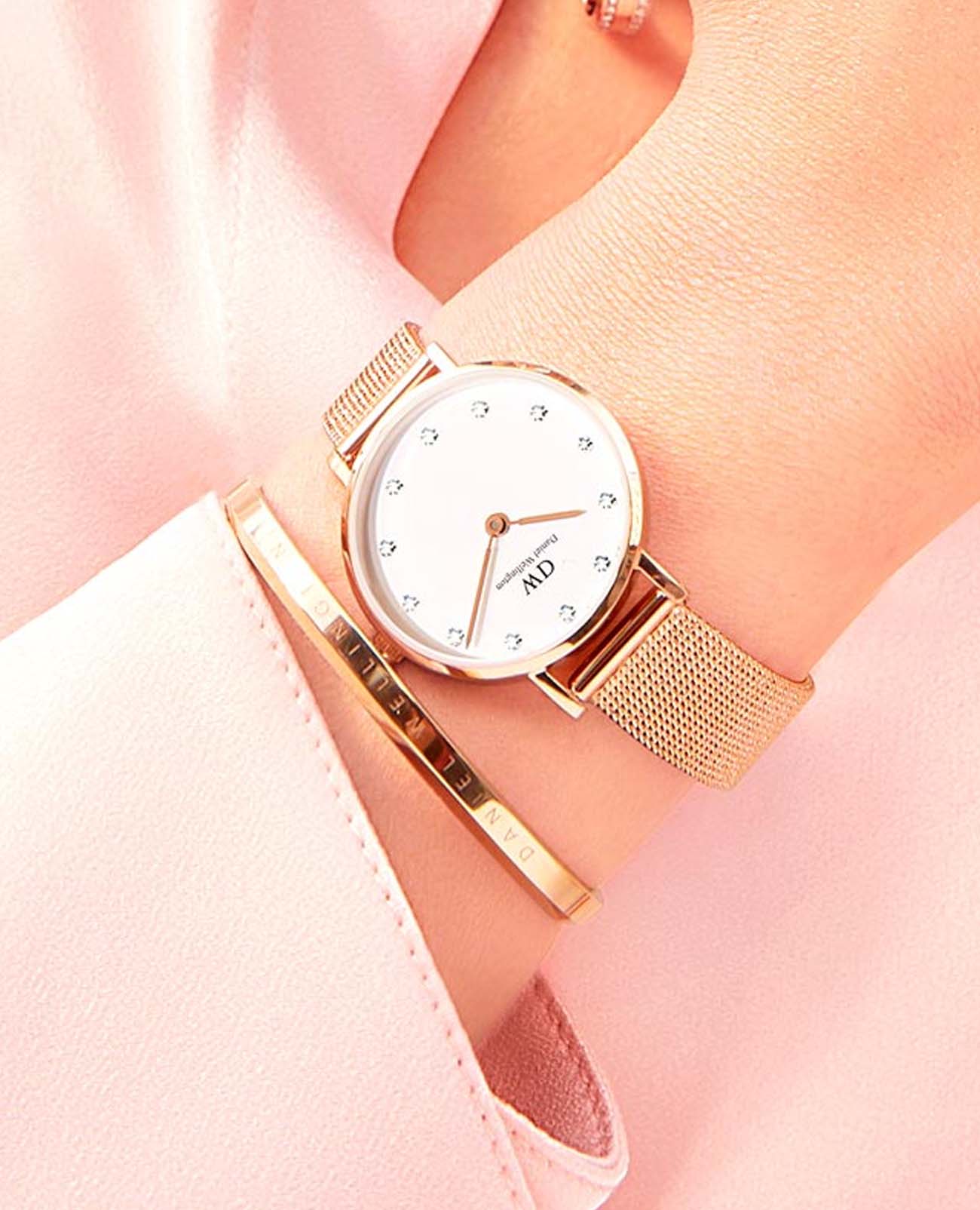 Женские наручные часы с минеральным стекломМинеральное стеклоМинеральное стекло представляет собой искусственно выращенный минерал кварца. Такое стекло отличается особой устойчивостью к повреждениям и царапинам. Уступает по некоторым качествам сапфировому стеклу. Daniel Wellington Petite DW00100604, кварцевый механизм с высокой точностью. Корпус часов изготовлен из стали с PVD-покрытиемPVDУльтратонкое покрытие наносится в технике вакуумного напыления, сочетает в себе нитрид титана особой прочности со слоем золота или оксида хрома. Несёт в себе декоративную или защитную функцию.. Циферблат украшен 12 кристаллами Swarovski. Класс водозащиты: 30 метров, позволит защитить корпус от случайных брызг или капель дождя. Стальной браслет миланского плетения с PVD-покрытиемPVDУльтратонкое покрытие наносится в технике вакуумного напыления, сочетает в себе нитрид титана особой прочности со слоем золота или оксида хрома. Несёт в себе декоративную или защитную функцию. на раскладном замкеРаскладной замокДанный вариант застежки используется только на часах с металлическим браслетом. Отличительная особенность такого крепления в том, что длина браслета становится универсальной и вы можете самостоятельно отрегулировать нужный вам размер – застежка просто двигается по браслету часов..