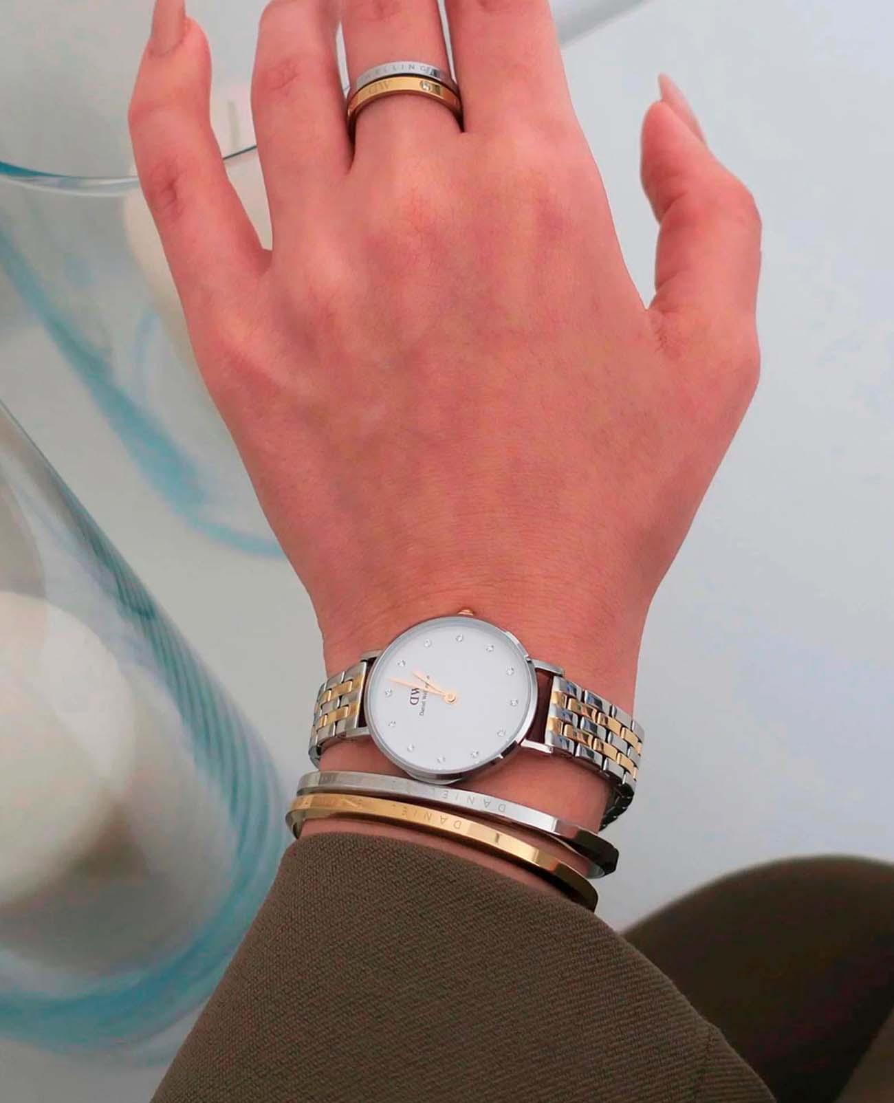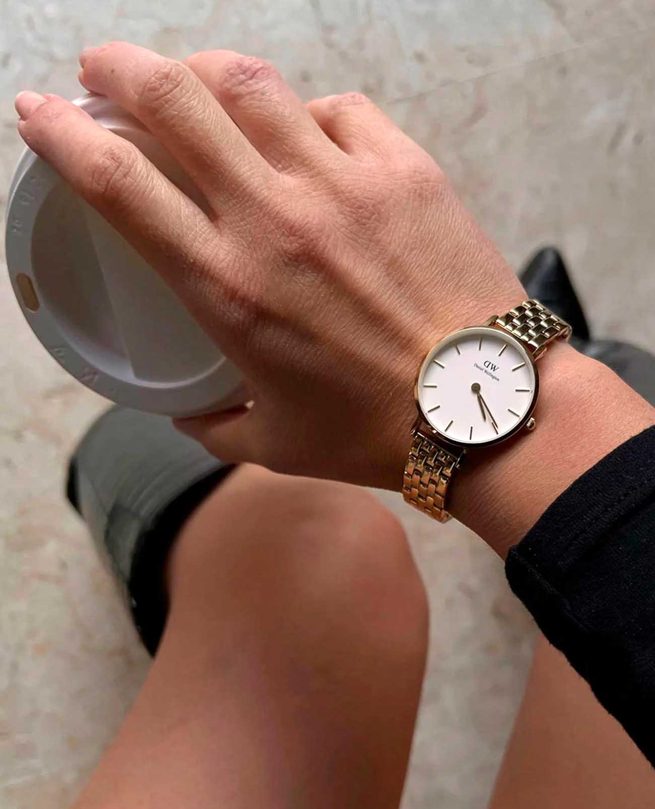 Женские наручные часы с минеральным стекломМинеральное стеклоМинеральное стекло представляет собой искусственно выращенный минерал кварца. Такое стекло отличается особой устойчивостью к повреждениям и царапинам. Уступает по некоторым качествам сапфировому стеклу. Daniel Wellington Petite DW00100616, кварцевый механизм с высокой точностью. Корпус часов изготовлен из стали. Циферблат украшен 12 кристаллами Swarovski. Класс водозащиты: 30 метров, позволит защитить корпус от случайных брызг или капель дождя. Стальной браслет с частичным застёжке-бабочке с кнопкамиЗастёжка "бабочка"Такой вид застёжки дополняется предохранителями, помогающими избежать случайного раскрытия браслета. Обладают изящным исполнением. PVDУльтратонкое покрытие наносится в технике вакуумного напыления, сочетает в себе нитрид титана особой прочности со слоем золота или оксида хрома. Несёт в себе декоративную или защитную функцию.