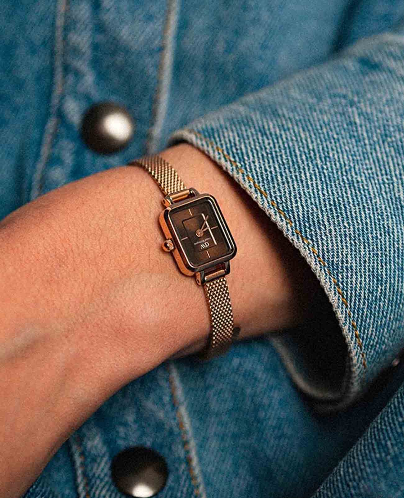 Женские наручные часы с минеральным стекломМинеральное стеклоМинеральное стекло представляет собой искусственно выращенный минерал кварца. Такое стекло отличается особой устойчивостью к повреждениям и царапинам. Уступает по некоторым качествам сапфировому стеклу. Daniel Wellington Quadro DW00100654, кварцевый механизм с высокой точностью. Корпус часов изготовлен из стали с PVD-покрытиемPVDУльтратонкое покрытие наносится в технике вакуумного напыления, сочетает в себе нитрид титана особой прочности со слоем золота или оксида хрома. Несёт в себе декоративную или защитную функцию.. Двухуровневый циферблат выполнен по технологии Sunray (солнечные лучи) и украшен фирменным логотипом Daniel Wellington. Накладные метки в виде штрихов. Рифленая заводная головка. Индивидуальный серийный номер. Класс водозащиты: 30 метров, позволит защитить корпус от случайных брызг или капель дождя. Стальной браслет миланского плетения с PVD-покрытиемPVDУльтратонкое покрытие наносится в технике вакуумного напыления, сочетает в себе нитрид титана особой прочности со слоем золота или оксида хрома. Несёт в себе декоративную или защитную функцию. на раскладном замкеРаскладной замокДанный вариант застежки используется только на часах с металлическим браслетом. Отличительная особенность такого крепления в том, что длина браслета становится универсальной и вы можете самостоятельно отрегулировать нужный вам размер – застежка просто двигается по браслету часов..