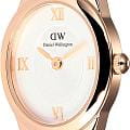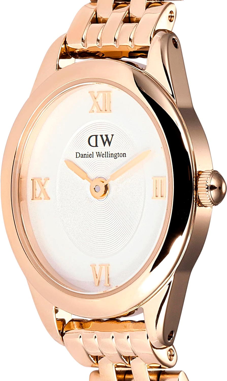 Daniel Wellington Ophelia — женственные часы с овальным корпусом 22 мм из нержавеющей стали с изящным PVDPVDУльтратонкое покрытие наносится в технике вакуумного напыления, сочетает в себе нитрид титана особой прочности со слоем золота или оксида хрома. Несёт в себе декоративную или защитную функцию.-покрытием в цвете золота. Глубокий циферблат с радиальным переливом украшен римскими индексами, что придаёт образу классическую элегантность.
