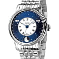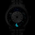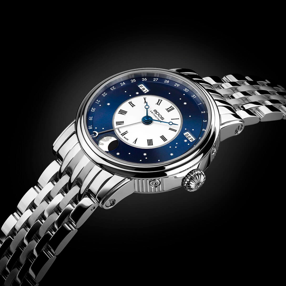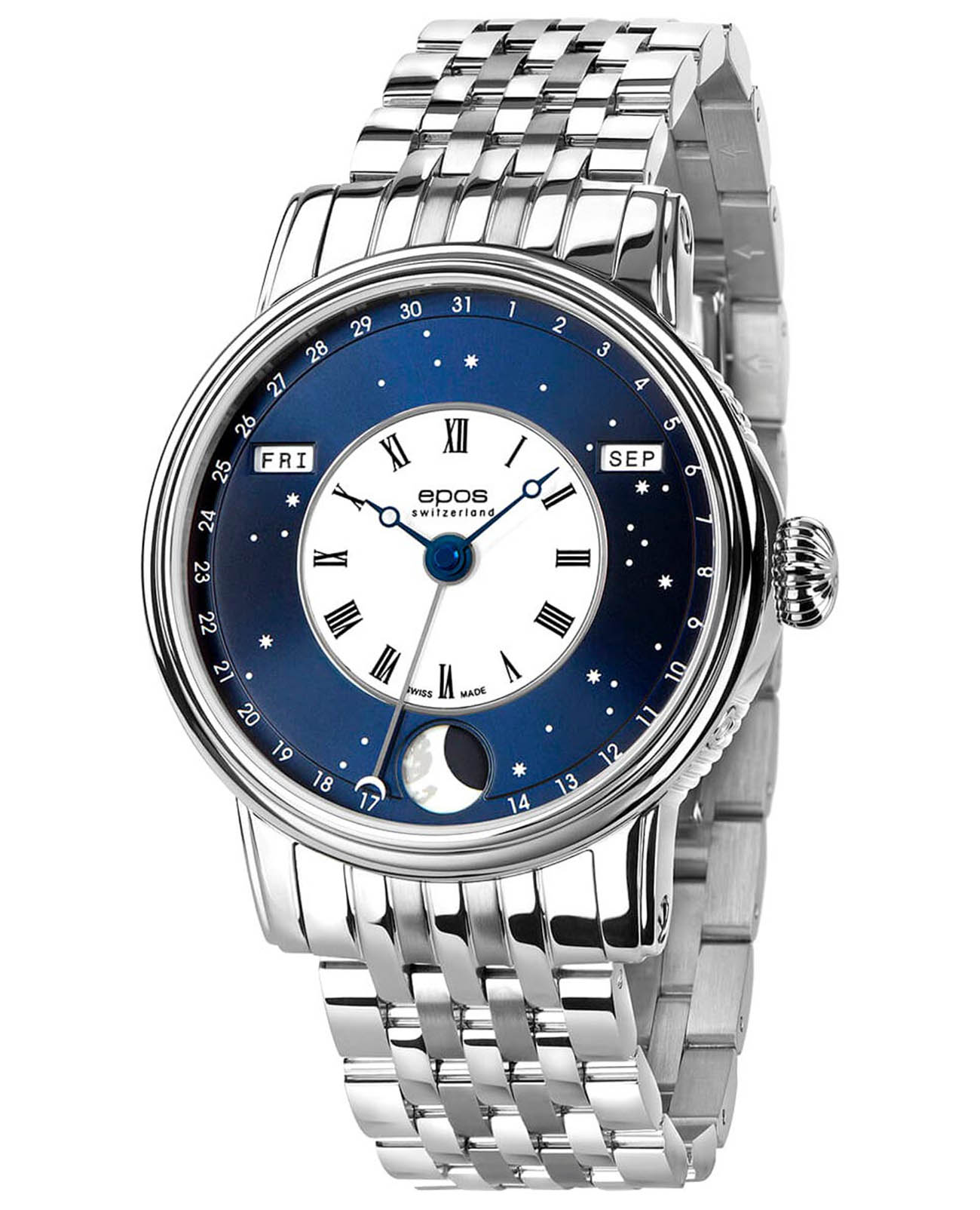 Мужские швейцарские механические часы с автоподзаводом Epos Oeuvre d'art 3439.322.20.26.30. Сапфировое стеклоСапфировое стеклоПрочный и надёжный материал из кристалла сапфира синтетического происхождения, характеризующийся особой твёрдостью и устойчивостью к царапинам и повреждениям. устойчивое к появлению царапин, обладающее высокой прозрачностью. Корпус часов изготовлен из нержавеющей стали. В механизме 25 камней, частота 28800 полуколебаний в час. Запас хода 42 часа. Механизм декорирован узором Cotes de Geneve. Циферблат в виде симбиоза белой лакированной вставки с римскими цифрами и вставки в виде ночного неба, выполненной по технологии Sunray (солнечные лучи). Светящиеся звезды  и большая луна с люминесцентной подсветкойЛюминесцентное покрытиеПозволяет считывать показания времени в темноте. Производители наносят на стрелки, часовые индексы, безель или поверхность циферблата светонакопительный состав, дающий холодное свечение.. Дата отображается центральной стрелкой. Окошко дня недели и месяца. Автоматический указатель фазы луны. Винтажная заводная головка. Прозрачная задняя крышка. Класс водозащиты: 50 метров, позволит защитить корпус от случайных брызг или капель дождя. Стальной браслет на раскладной застёжкеРаскладная застёжкаТакой тип застёжки используется только на браслетах из металла. Она никогда не раскрывается полностью, происходит разделение на 2 и более частей. Раскладывающая застёжка снизит вероятность потери часов к минимуму..