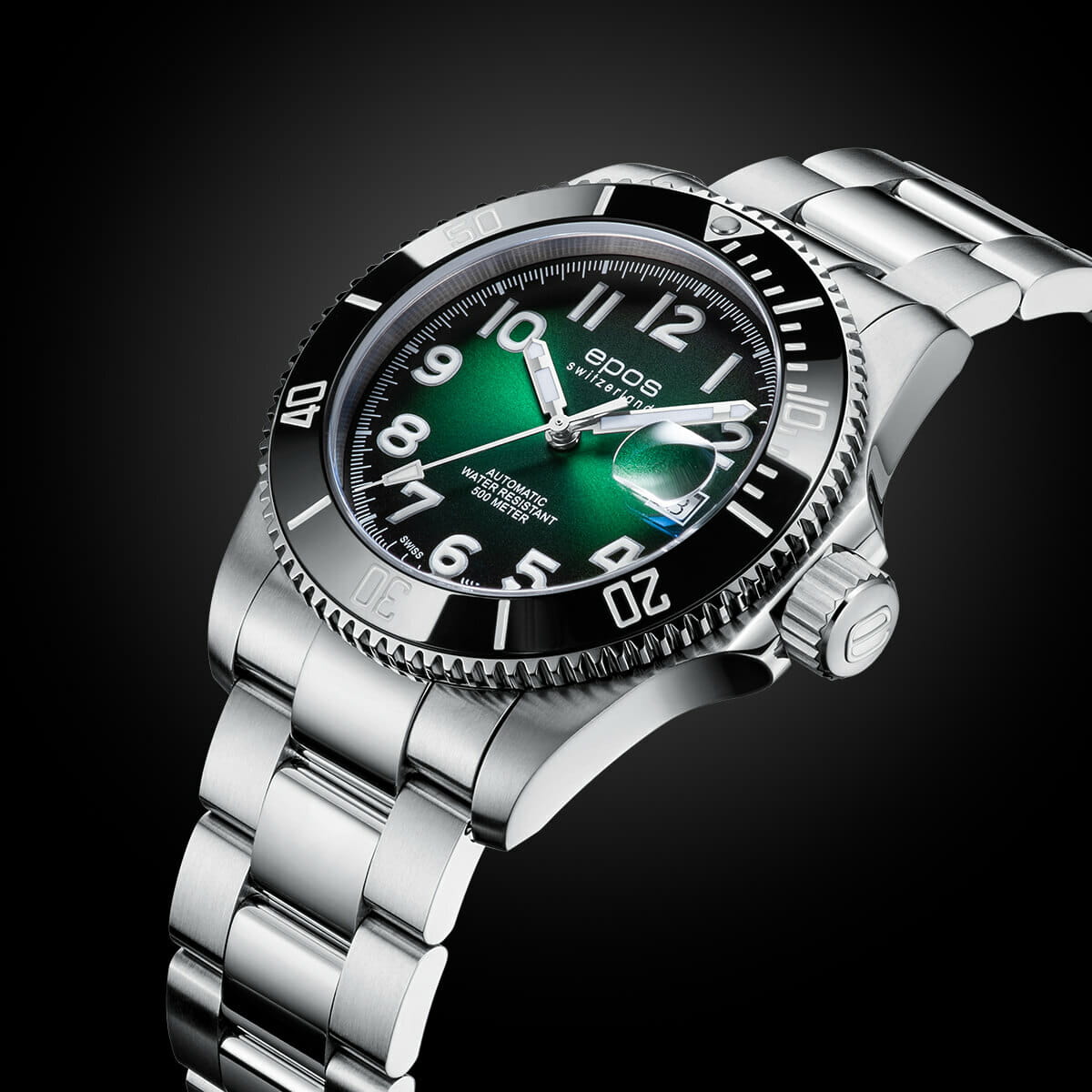 Мужские механические часы с автоподзаводом Epos — это профессиональный дайверский инструмент с швейцарским качеством. Корпус диаметром 41,5 мм и толщиной 13,3 мм выполнен из титана, что обеспечивает лёгкость и высокую прочность. Циферблат зелёного цвета оформлен контрастными метками и стрелками. Циферблат защищён сапфировым стекломСапфировое стеклоПрочный и надёжный материал из кристалла сапфира синтетического происхождения, характеризующийся особой твёрдостью и устойчивостью к царапинам и повреждениям.. Механизм — швейцарский калибр Sellita SW200. Окошко даты расположено в положении 3 часов. БезельБезельВнешний ободок, закрепляющий стекло. В спортивных часах так называется поворотное кольцо с делениями на циферблате, выполняет роль таймера – замеряет отрезки времени на шкале. Неподвижный безель – элемент декора. Однонаправленно вращающийся безель на дайверских часах позволяет фиксировать моменты погружения и выныривания на поверхность. — однонаправленный вращающийся. Завинчивающаяся коронка и автоматический гелиевый клапан позволяют использовать часы при глубоководных погружениях. Часы оснащены титановым браслетом на раскладной застёжкеРаскладная застёжкаТакой тип застёжки используется только на браслетах из металла. Она никогда не раскрывается полностью, происходит разделение на 2 и более частей. Раскладывающая застёжка снизит вероятность потери часов к минимуму.. Водонепроницаемость 500 м соответствует требованиям для профессионального дайвинга. Гарантия — 24 месяца. Идеальный выбор для тех, кто ценит надёжность, точность и экстремальные условия.