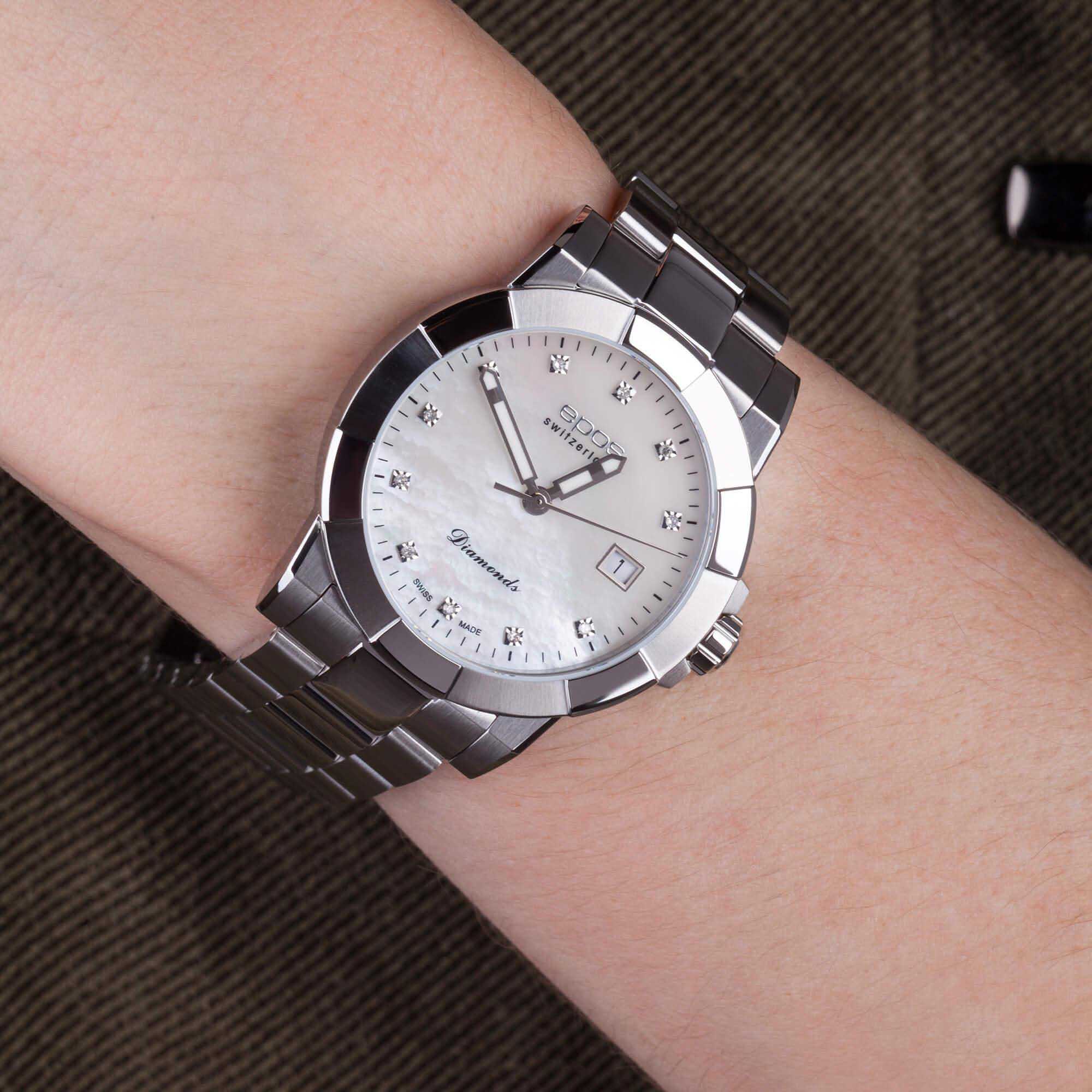 Женские швейцарские наручные часы с кварцевым механизмом с высокой точностью Epos Ladies 001.700.20.80.30. Сапфировое стеклоСапфировое стеклоПрочный и надёжный материал из кристалла сапфира синтетического происхождения, характеризующийся особой твёрдостью и устойчивостью к царапинам и повреждениям. устойчивое к появлению царапин, обладающее высокой прозрачностью. Корпус часов изготовлен из нержавеющей стали. Циферблат украшен бриллиантами. Окошко даты находится в положении 3 часа. Класс водозащиты: 50 метров, позволит защитить корпус от случайных брызг или капель дождя. Стальной браслет на раскладной застёжкеРаскладная застёжкаТакой тип застёжки используется только на браслетах из металла. Она никогда не раскрывается полностью, происходит разделение на 2 и более частей. Раскладывающая застёжка снизит вероятность потери часов к минимуму..