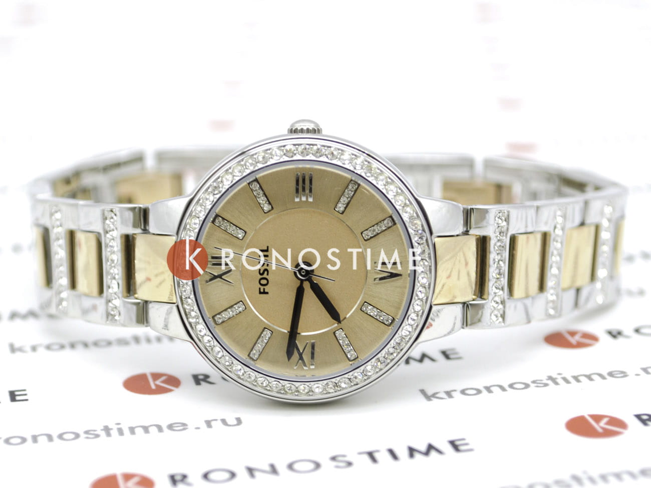 Циферблат золотистого цвета с накладными рисками, украшенными стразами и серебристыми римскими цифрами.