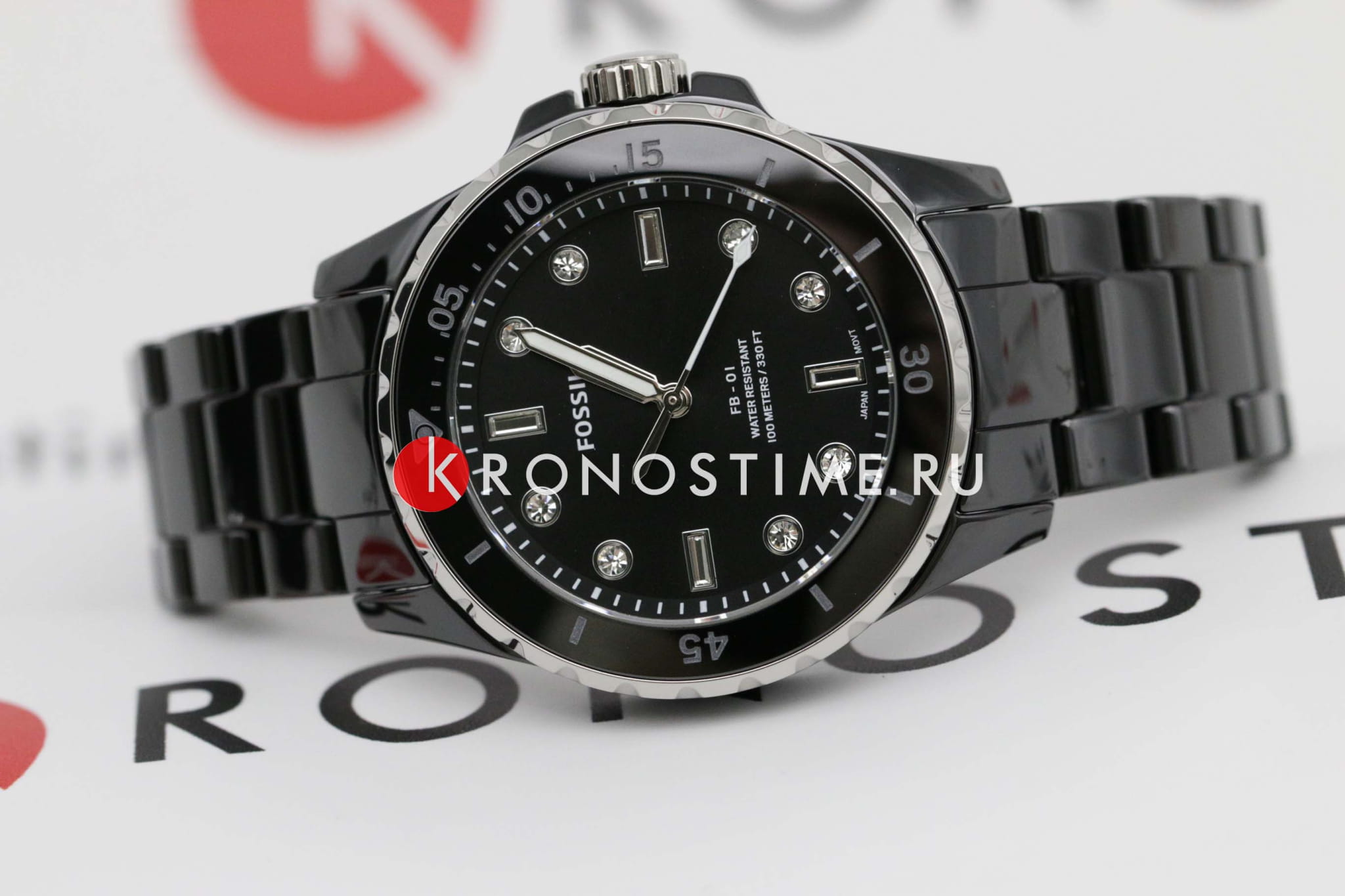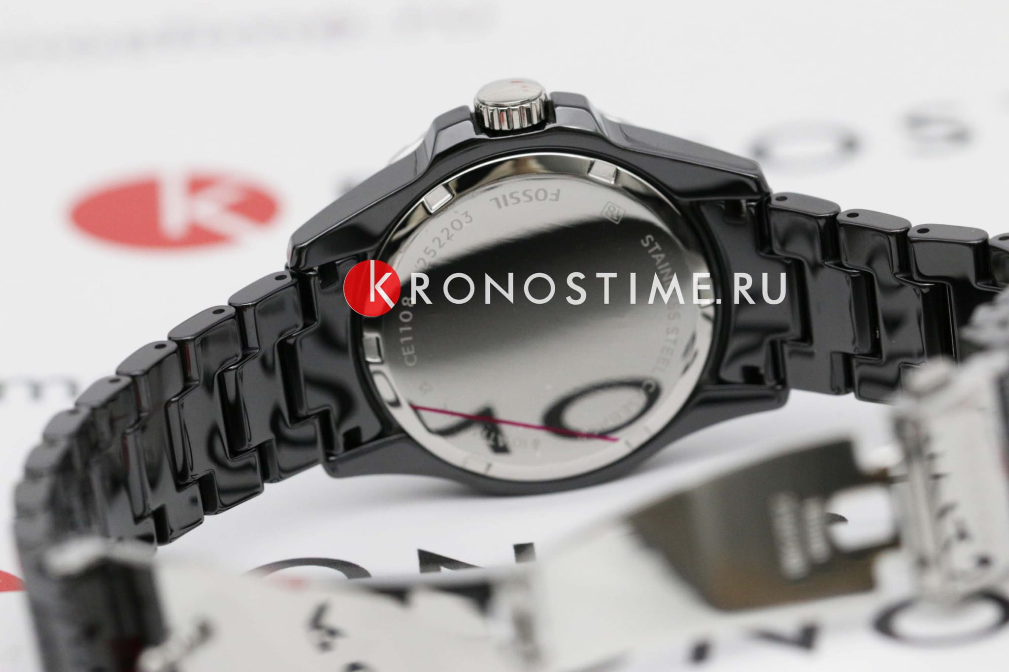 Женские наручные часы с кристаллами Fossil FB-01 CE1108, кварцевый механизм с высокой точностью. Класс водозащиты: 100 метров, позволит плавать, нырять и заниматься другими водными видами спорта. Стрелки с люминесцентным покрытиемЛюминесцентное покрытиеПозволяет считывать показания времени в темноте. Производители наносят на стрелки, часовые индексы, безель или поверхность циферблата светонакопительный состав, дающий холодное свечение.. Циферблат украшен кристаллами. Корпус часов изготовлен из стали с IP-покрытиемIP-покрытиеМетод ионного напыления. Демонстрирует повышенную устойчивость к истиранию, окислению и химическим веществам. Под воздействием высокого давления и температуры около 1500°C молекулы металла надёжно соединяются с частицами корпуса часов.. Керамический браслет с раскладной застёжкойРаскладная застёжкаТакой тип застёжки используется только на браслетах из металла. Она никогда не раскрывается полностью, происходит разделение на 2 и более частей. Раскладывающая застёжка снизит вероятность потери часов к минимуму..