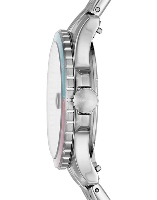 Женские наручные часы на браслете Fossil FB-01 ES4741, кварцевый механизм с высокой точностью. Класс водозащиты: 100 метров, позволит плавать, нырять и заниматься другими водными видами спорта. Корпус часов изготовлен из стали, серебристого цвета.
