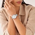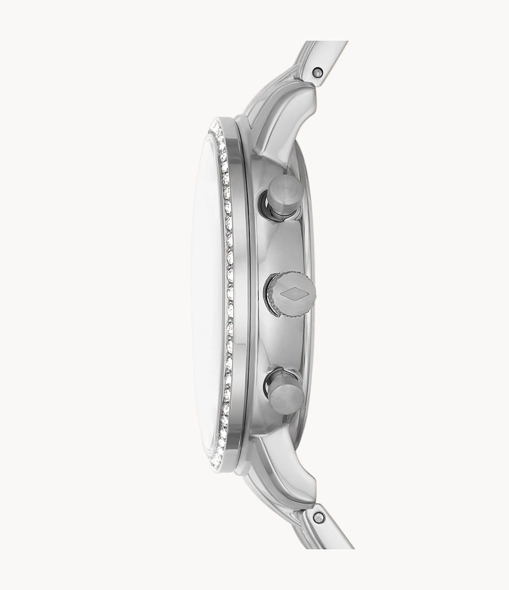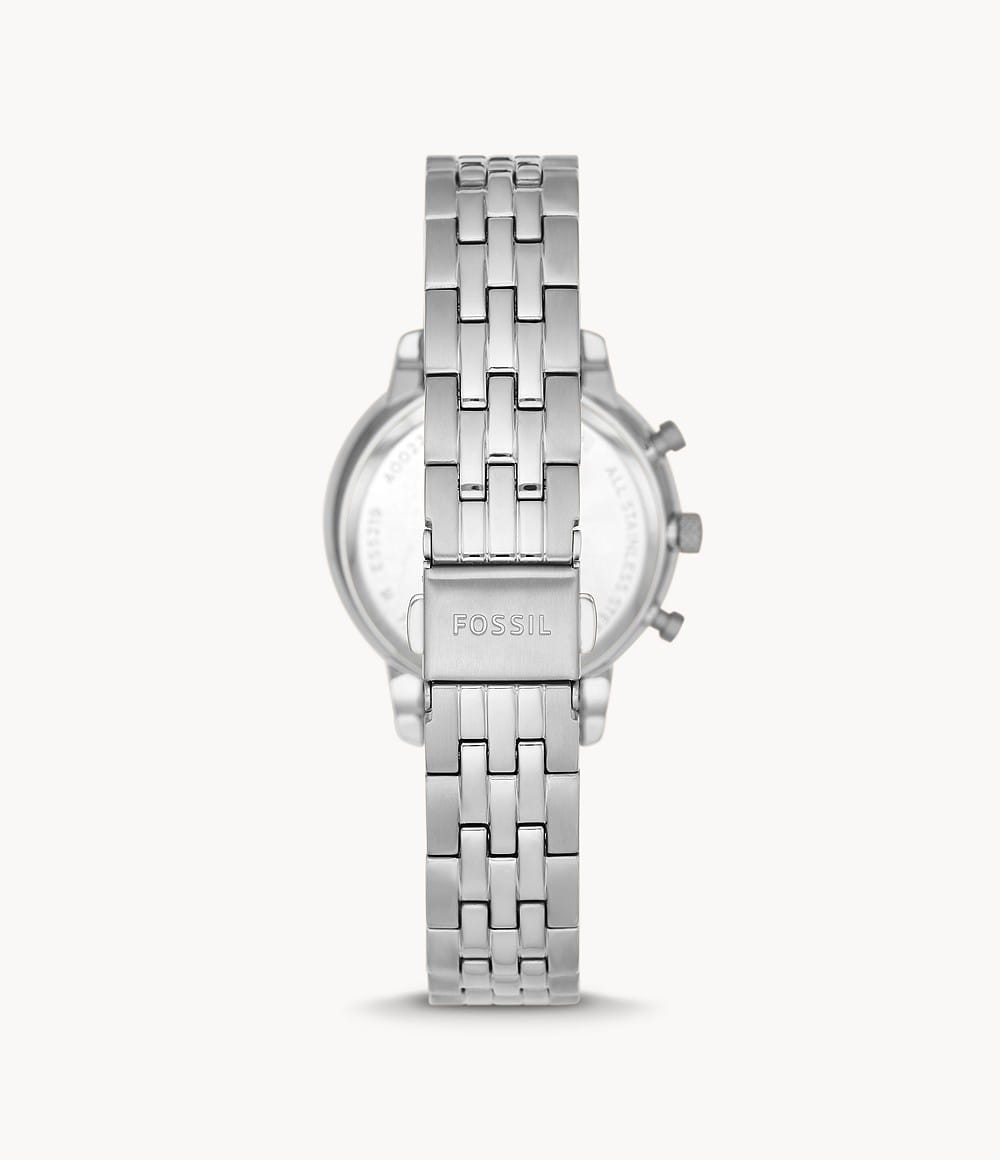 Женские американские часы-хронографХронографФункция позволяет измерять отрезки времени с особой точностью: часы, минуты, секунды. Верным признаком хронографа является наличие на циферблате 3 дополнительных окошек-счётчиков. с секундомеромСекундомерСекундоме́р — прибор, способный измерять интервалы времени с точностью до долей секунды. Fossil Neutra ES5217, кварцевый механизм с высокой точностью. Класс водозащиты: 50 метров, позволит защитить корпус от случайных брызг или капель дождя. Корпус часов изготовлен из стали. Стальной браслет с раскладной застёжкойРаскладная застёжкаТакой тип застёжки используется только на браслетах из металла. Она никогда не раскрывается полностью, происходит разделение на 2 и более частей. Раскладывающая застёжка снизит вероятность потери часов к минимуму.. Система отображения времени 12-ти и 24-х часового формата. БезельБезельВнешний ободок, закрепляющий стекло. В спортивных часах так называется поворотное кольцо с делениями на циферблате, выполняет роль таймера – замеряет отрезки времени на шкале. Неподвижный безель – элемент декора. Однонаправленно вращающийся безель на дайверских часах позволяет фиксировать моменты погружения и выныривания на поверхность. украшен кристаллами. Окошко даты между 4 и 5 часами. БезельБезельВнешний ободок, закрепляющий стекло. В спортивных часах так называется поворотное кольцо с делениями на циферблате, выполняет роль таймера – замеряет отрезки времени на шкале. Неподвижный безель – элемент декора. Однонаправленно вращающийся безель на дайверских часах позволяет фиксировать моменты погружения и выныривания на поверхность. инкрустирован кристаллами.