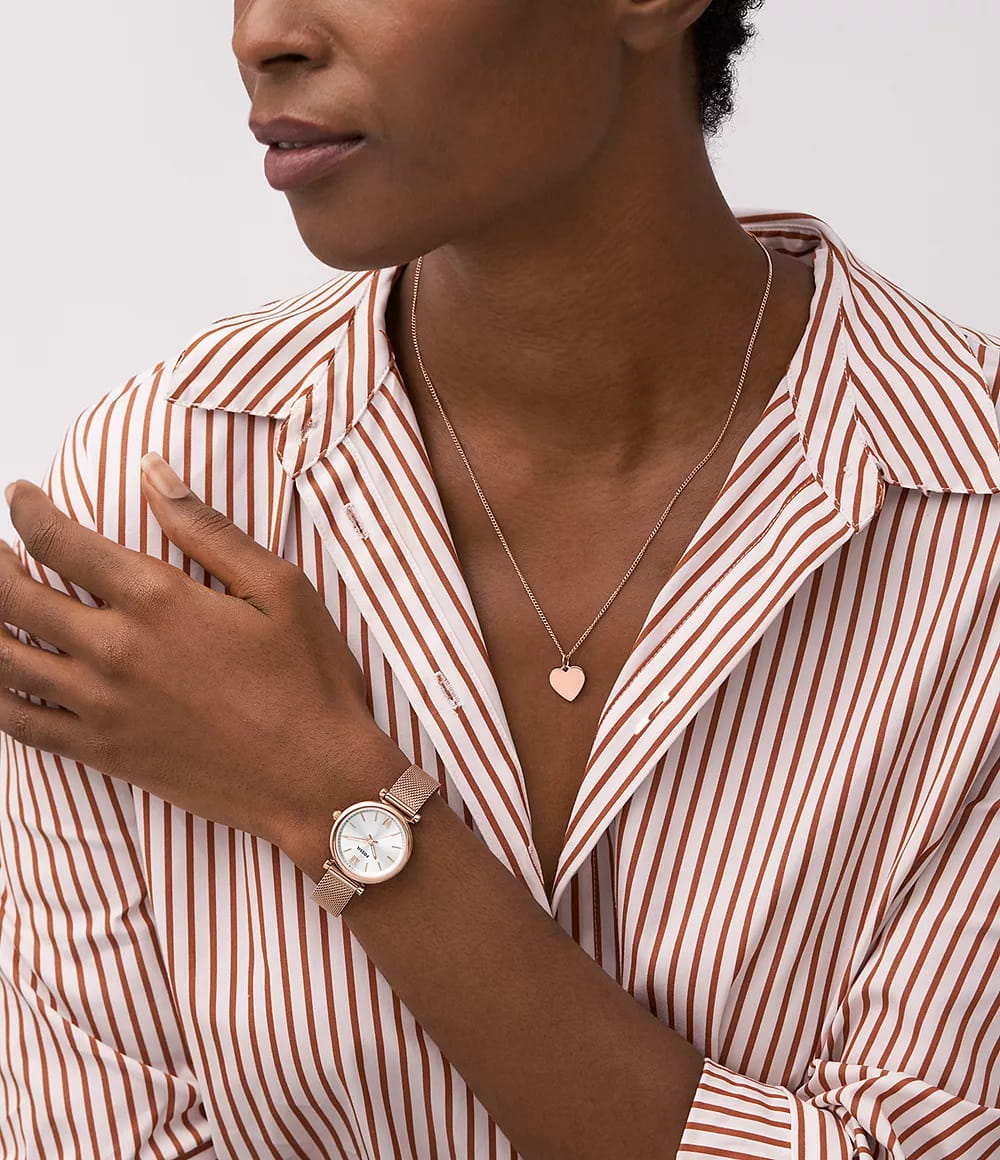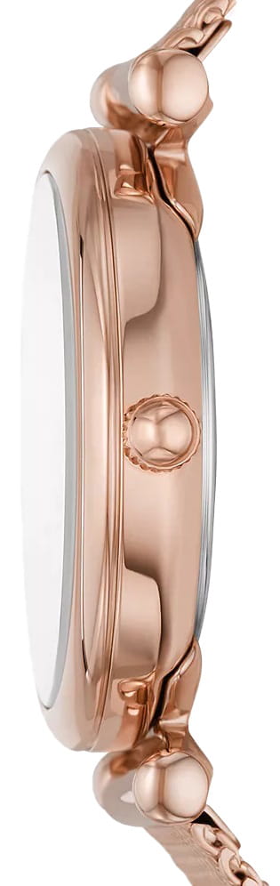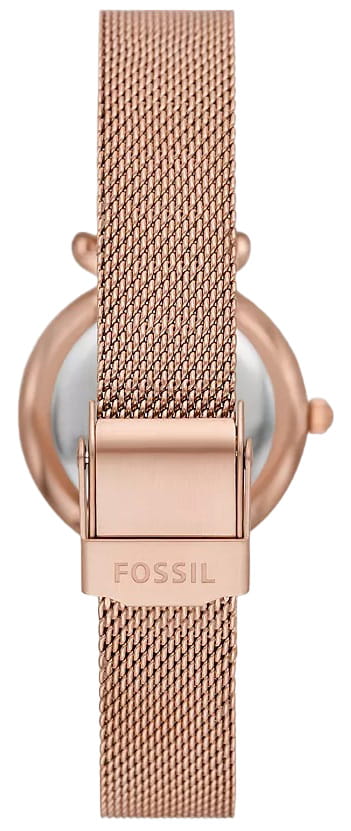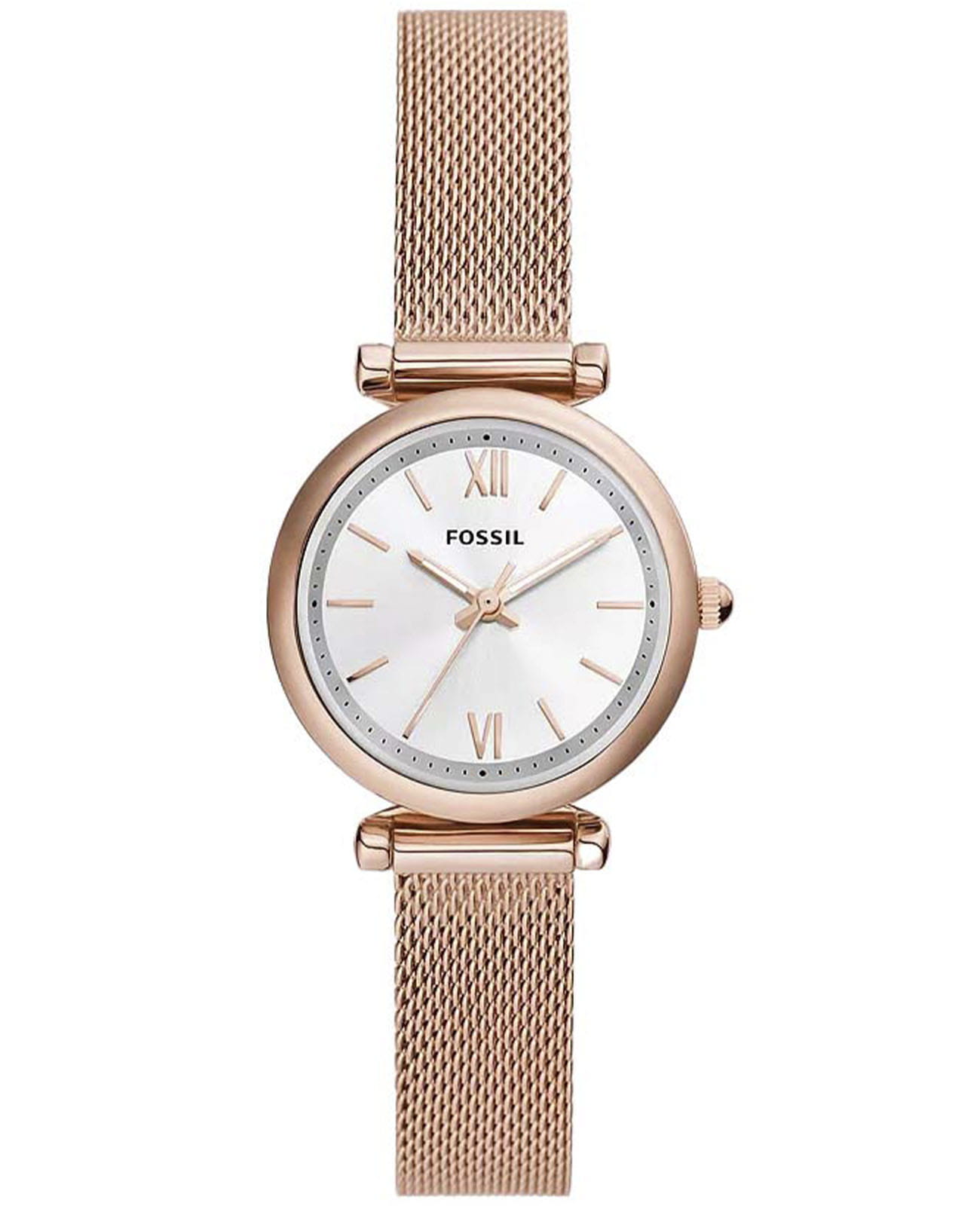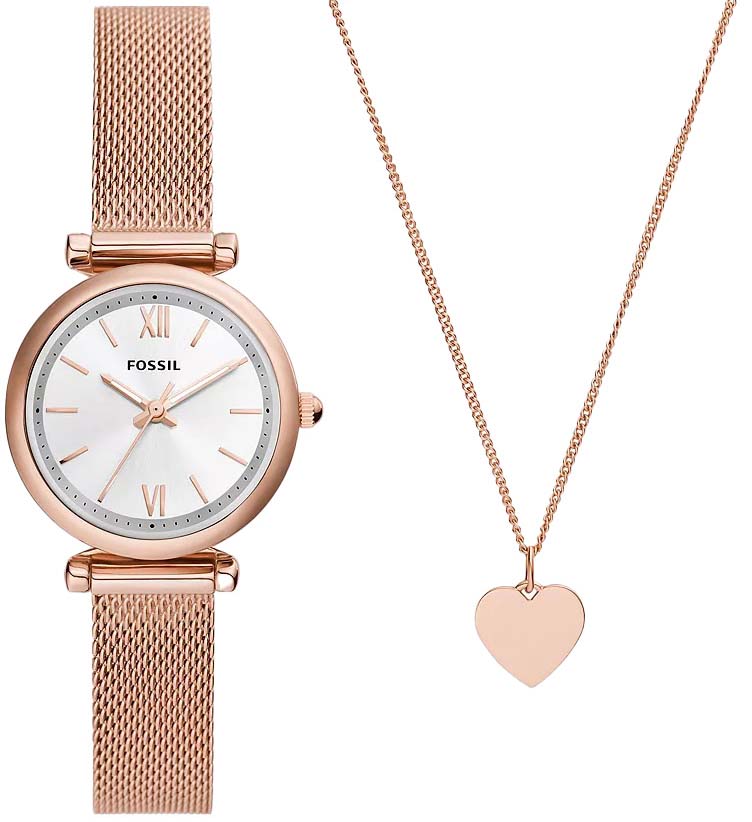 Женские американские часы с минеральным стекломМинеральное стеклоМинеральное стекло представляет собой искусственно выращенный минерал кварца. Такое стекло отличается особой устойчивостью к повреждениям и царапинам. Уступает по некоторым качествам сапфировому стеклу. Fossil Carlie ES5314SET, кварцевый механизм с высокой точностью. Корпус и браслет часов изготовлены из нержавеющей стали с IP-покрытиемIP-покрытиеМетод ионного напыления. Демонстрирует повышенную устойчивость к истиранию, окислению и химическим веществам. Под воздействием высокого давления и температуры около 1500°C молекулы металла надёжно соединяются с частицами корпуса часов.. Циферблат выполнен по технологии Sunray (солнечные лучи). Метки в виде арабских цифр и штрихов. Стрелки с люминесцентным покрытиемЛюминесцентное покрытиеПозволяет считывать показания времени в темноте. Производители наносят на стрелки, часовые индексы, безель или поверхность циферблата светонакопительный состав, дающий холодное свечение.. Рифленая заводная головка с защитой. Класс водозащиты: 50 метров, позволит защитить корпус от случайных брызг или капель дождя. Стальной браслет миланского плетения на раскладном замкеРаскладной замокДанный вариант застежки используется только на часах с металлическим браслетом. Отличительная особенность такого крепления в том, что длина браслета становится универсальной и вы можете самостоятельно отрегулировать нужный вам размер – застежка просто двигается по браслету часов.. В комплекте к часам прилагается кулон в виде сердца на цепочке.