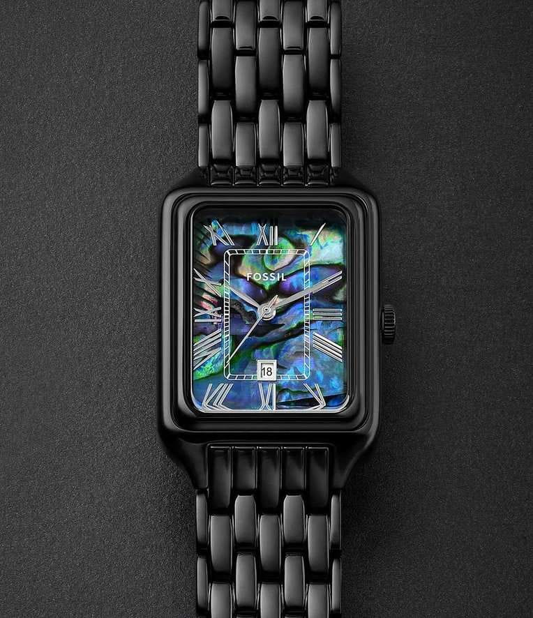 Часы Fossil ES5340 представляют собой изысканный аксессуар, который подчеркнет ваш стиль и внимание к деталям. Эти женские наручные часы выполнены в элегантном прямоугольном корпусе из стали с черным IP-покрытиемIP-покрытиеМетод ионного напыления. Демонстрирует повышенную устойчивость к истиранию, окислению и химическим веществам. Под воздействием высокого давления и температуры около 1500°C молекулы металла надёжно соединяются с частицами корпуса часов., обеспечивающим прочность и устойчивость к внешним воздействиям. Черный переливающийся циферблат, изготовленный из ракушки Абалона, придаёт модели особый шарм и утонченность. Метки в виде римских цифр придают классический акцент, а окошко даты в положении 6 часов делает часы функциональными и практичными. Рифленая заводная головка обеспечивает удобство настройки времени. Стальной браслет с IP-покрытиемIP-покрытиеМетод ионного напыления. Демонстрирует повышенную устойчивость к истиранию, окислению и химическим веществам. Под воздействием высокого давления и температуры около 1500°C молекулы металла надёжно соединяются с частицами корпуса часов. и раскладной застёжкойРаскладная застёжкаТакой тип застёжки используется только на браслетах из металла. Она никогда не раскрывается полностью, происходит разделение на 2 и более частей. Раскладывающая застёжка снизит вероятность потери часов к минимуму. гарантирует комфорт и надежную фиксацию на запястье. Водозащита 50WR защищает механизм от случайных брызг, а минеральное стеклоМинеральное стеклоМинеральное стекло представляет собой искусственно выращенный минерал кварца. Такое стекло отличается особой устойчивостью к повреждениям и царапинам. Уступает по некоторым качествам сапфировому стеклу. оберегает циферблат от повреждений. Часы имеют компактные размеры: ширина корпуса составляет 26 мм, ширина браслета - 14 мм, а длина браслета - 175 мм.