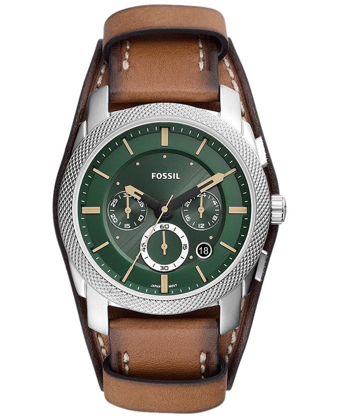 Мужские американские часы-хронографХронографФункция позволяет измерять отрезки времени с особой точностью: часы, минуты, секунды. Верным признаком хронографа является наличие на циферблате 3 дополнительных окошек-счётчиков. с секундомеромСекундомерСекундоме́р — прибор, способный измерять интервалы времени с точностью до долей секунды. Fossil Machine FS5962, кварцевый механизм с высокой точностью. Класс водозащиты: 50 метров, позволит защитить корпус от случайных брызг или капель дождя. Корпус часов изготовлен из стали. Метки в виде штрихов. Окошко даты находится между часовыми отметками 4 и 5. Рифленая заводная головка. Ремешок из эко-кожи с классической застежкой.  Рифленая заводная головка и безельБезельВнешний ободок, закрепляющий стекло. В спортивных часах так называется поворотное кольцо с делениями на циферблате, выполняет роль таймера – замеряет отрезки времени на шкале. Неподвижный безель – элемент декора. Однонаправленно вращающийся безель на дайверских часах позволяет фиксировать моменты погружения и выныривания на поверхность..