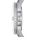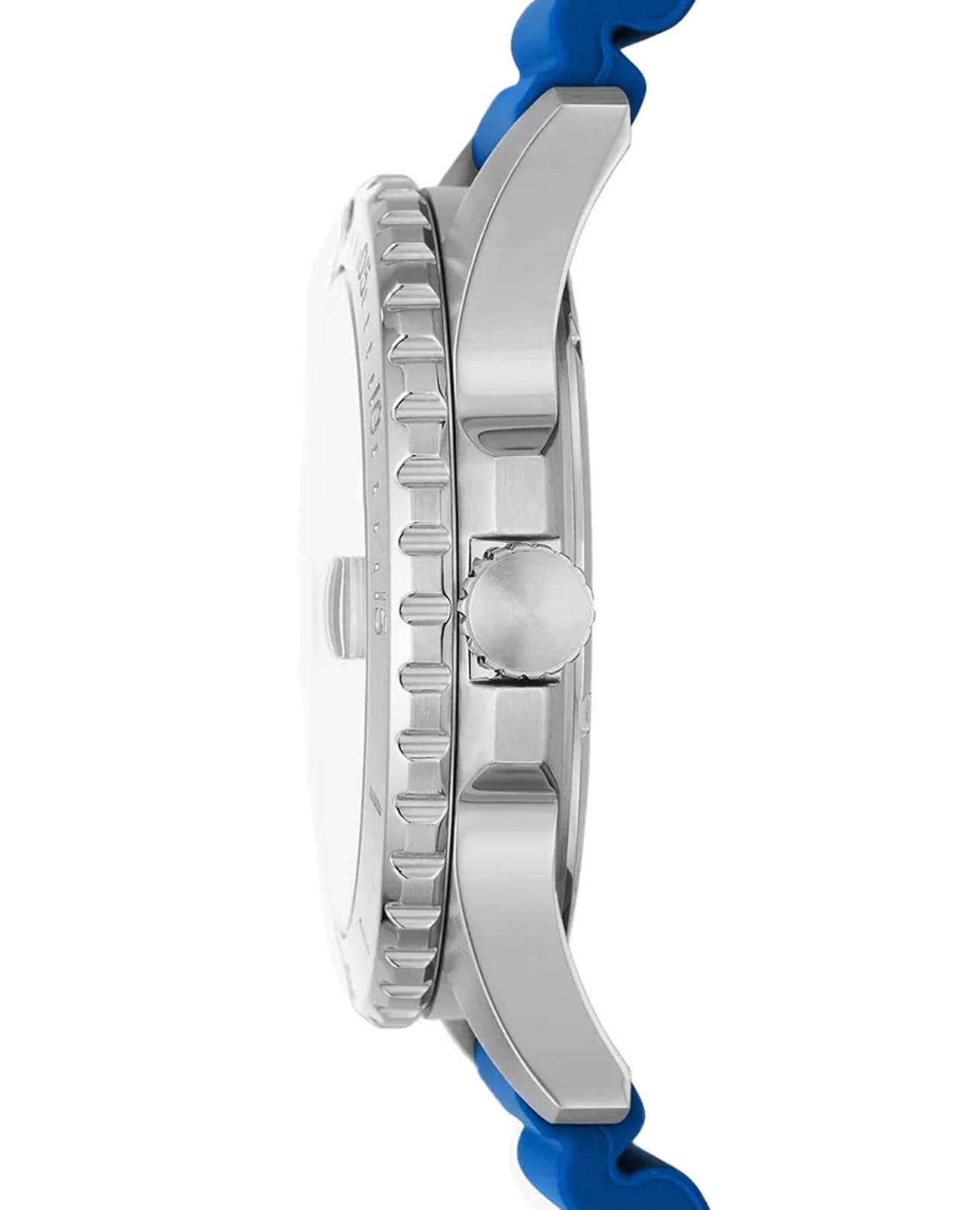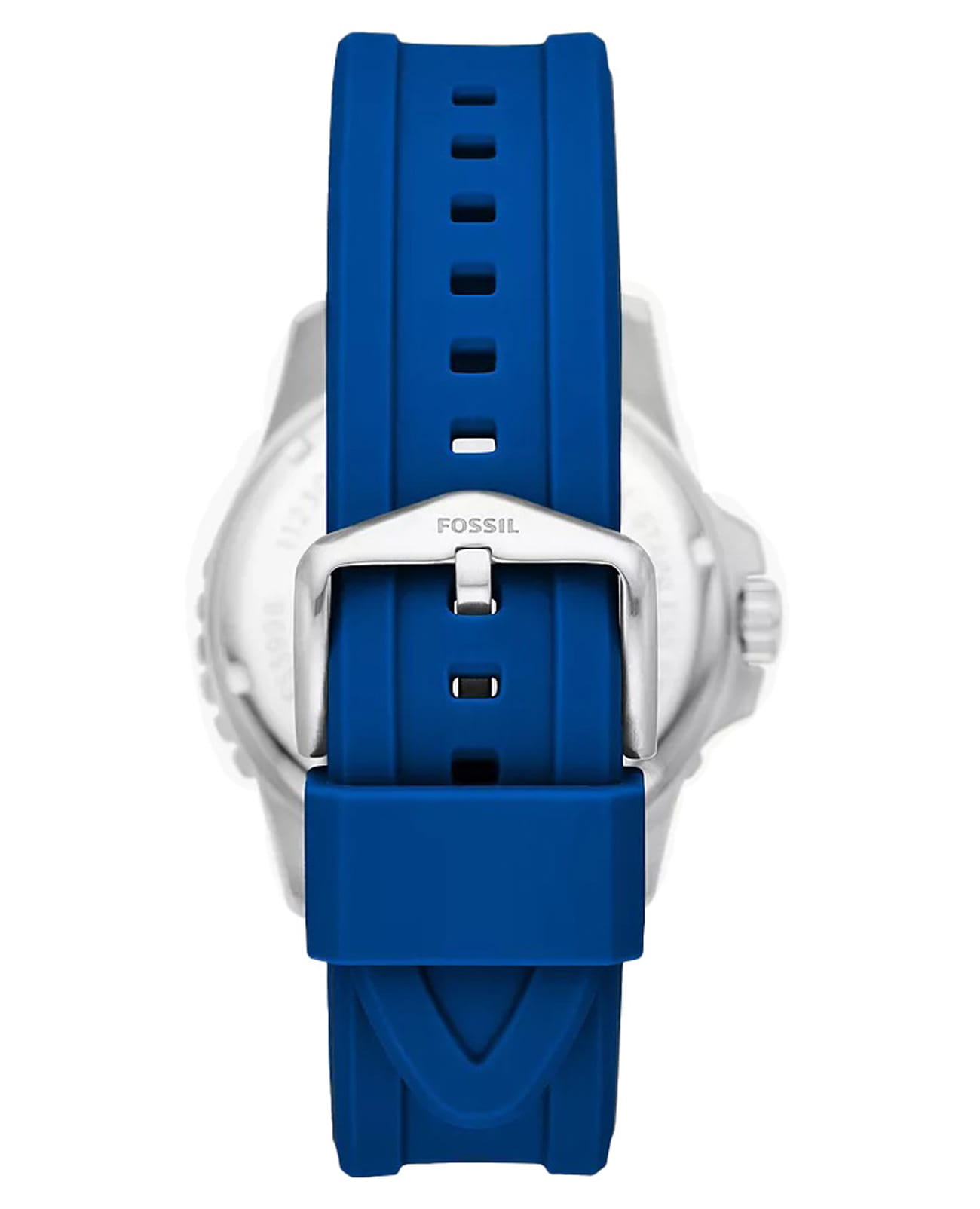 Мужские американские часы с минеральным стекломМинеральное стеклоМинеральное стекло представляет собой искусственно выращенный минерал кварца. Такое стекло отличается особой устойчивостью к повреждениям и царапинам. Уступает по некоторым качествам сапфировому стеклу. Fossil Blue FS5998, кварцевый механизм с высокой точностью. Корпус часов изготовлен из нержавеющей стали. Вращающийся безельБезельВнешний ободок, закрепляющий стекло. В спортивных часах так называется поворотное кольцо с делениями на циферблате, выполняет роль таймера – замеряет отрезки времени на шкале. Неподвижный безель – элемент декора. Однонаправленно вращающийся безель на дайверских часах позволяет фиксировать моменты погружения и выныривания на поверхность.. Метки и стрелки с люминесцентным покрытиемЛюминесцентное покрытиеПозволяет считывать показания времени в темноте. Производители наносят на стрелки, часовые индексы, безель или поверхность циферблата светонакопительный состав, дающий холодное свечение.. Окошко даты находится в положении 3 часа. Рифленая заводная головка с защитой. Класс водозащиты: 100 метров, позволит плавать, нырять и заниматься другими водными видами спорта. Силиконовый ремешок на стандартной застёжке.