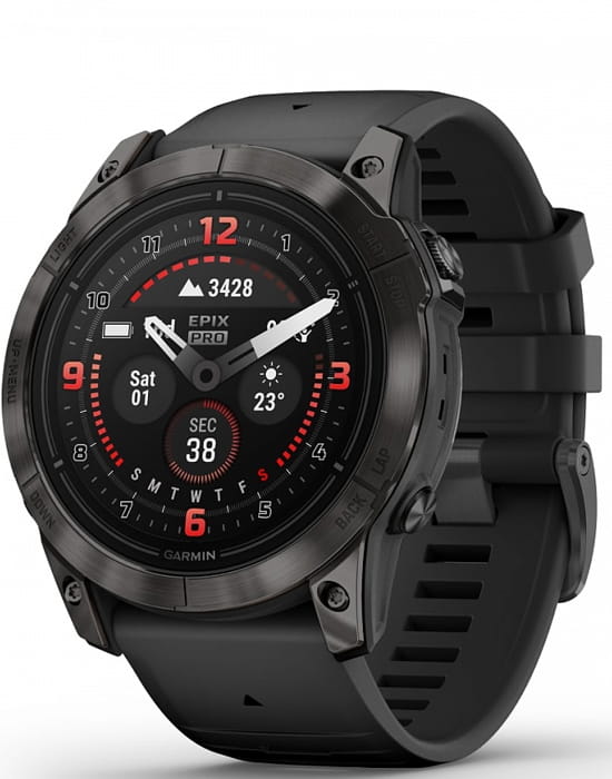 Умные многофункциональные мужские часы Garmin Epix Pro (Gen 2) Sapphire Edition 010-02804-01, электронный механизм с высокой точностью. Класс водозащиты: 100 метров, позволит плавать, нырять и заниматься другими водными видами спорта. Стальной корпус. Циферблат с сапфировым стекломСапфировое стеклоПрочный и надёжный материал из кристалла сапфира синтетического происхождения, характеризующийся особой твёрдостью и устойчивостью к царапинам и повреждениям.. Экран с светодиодной подсветкойСветодиодная подсветкаСветодиодная или LED-подсветка обеспечивает появление яркого холодного свечения за счёт LED-элементов - маленьких лампочек. Они потребляют минимальное количество энергии, чаще всего можно встретить 1 светодиод, в нижней части циферблата.. Силиконовый ремешок на стандартной застёжке. Безель из титана с DLC-покрытиемDLC-покрытиеDiamond like carbon - одно из лучших видов покрытия, представляющее собой углерод с алмазными свойствами. На поверхность материала наносятся распавшиеся молекулы углерода, превращающиеся в плёнку из алмазоподобных связей, которая перенимает твёрдость алмаза.