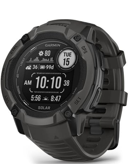 Умные многофункциональные мужские часы Garmin Instinct 2X Solar 010-02805-00, электронный механизм с высокой точностью. Класс водозащиты: 100 метров, позволит плавать, нырять и заниматься другими водными видами спорта. Материал корпуса: Фиброармированный полимер Ударопрочный корпусУдаропрочный корпусМеханизм заключён в корпус, выполненный из современных материалов, устойчивых к ударам, механическим повреждениям и падению с высоты: инновационный пластик, карбон, нержавеющая сталь, титан.. Минеральное стеклоМинеральное стеклоМинеральное стекло представляет собой искусственно выращенный минерал кварца. Такое стекло отличается особой устойчивостью к повреждениям и царапинам. Уступает по некоторым качествам сапфировому стеклу. которое было химически усиленно. Экран с светодиодной подсветкойСветодиодная подсветкаСветодиодная или LED-подсветка обеспечивает появление яркого холодного свечения за счёт LED-элементов - маленьких лампочек. Они потребляют минимальное количество энергии, чаще всего можно встретить 1 светодиод, в нижней части циферблата..