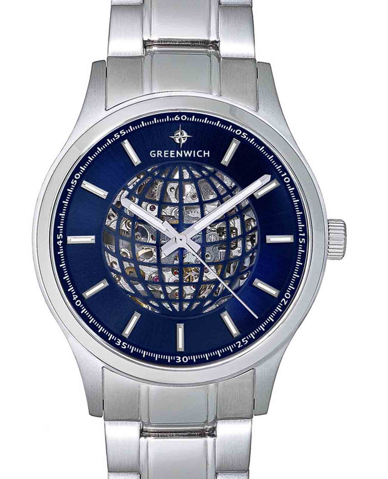 Мужские механические часы с минеральным стекломМинеральное стеклоМинеральное стекло представляет собой искусственно выращенный минерал кварца. Такое стекло отличается особой устойчивостью к повреждениям и царапинам. Уступает по некоторым качествам сапфировому стеклу. Greenwich Globe GW 056.10.36. Корпус часов изготовлен из стали. Стрелки с люминесцентным покрытиемЛюминесцентное покрытиеПозволяет считывать показания времени в темноте. Производители наносят на стрелки, часовые индексы, безель или поверхность циферблата светонакопительный состав, дающий холодное свечение.. Класс водозащиты: 100 метров, позволит плавать, нырять и заниматься другими водными видами спорта. Стальной браслет на раскладной застёжкеРаскладная застёжкаТакой тип застёжки используется только на браслетах из металла. Она никогда не раскрывается полностью, происходит разделение на 2 и более частей. Раскладывающая застёжка снизит вероятность потери часов к минимуму..
