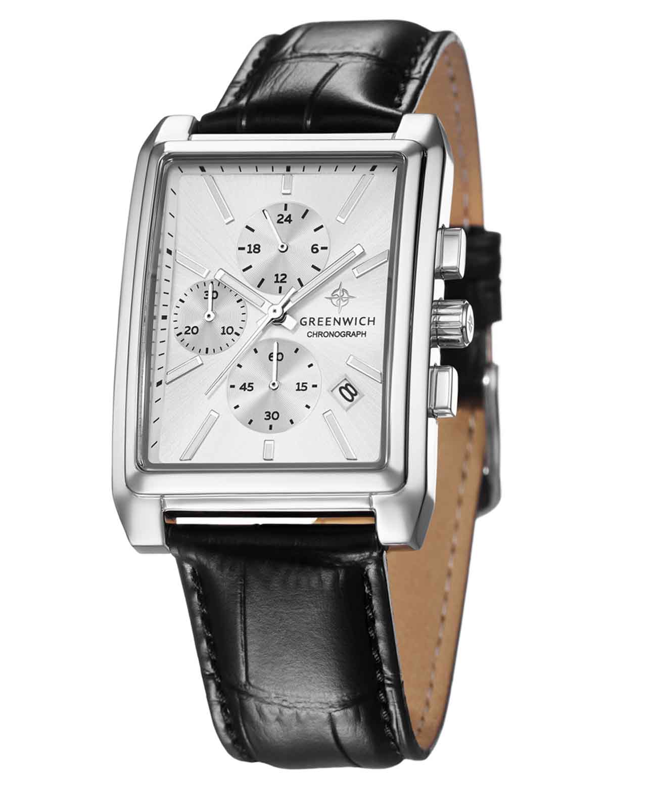 Мужские часы-хронографХронографФункция позволяет измерять отрезки времени с особой точностью: часы, минуты, секунды. Верным признаком хронографа является наличие на циферблате 3 дополнительных окошек-счётчиков. Greenwich Galeon GW 553.11.11, кварцевый механизм с минеральным стекломМинеральное стеклоМинеральное стекло представляет собой искусственно выращенный минерал кварца. Такое стекло отличается особой устойчивостью к повреждениям и царапинам. Уступает по некоторым качествам сапфировому стеклу.. Корпус из нержавеющей стали. Стрелки и метки с люминесцентным покрытиемЛюминесцентное покрытиеПозволяет считывать показания времени в темноте. Производители наносят на стрелки, часовые индексы, безель или поверхность циферблата светонакопительный состав, дающий холодное свечение.. Окошко даты находится в положении между 4 и 5 часами. Класс водозащиты: 50 метров, позволит защитить корпус от случайных брызг или капель дождя. Кожаный ремешок на стандартной застежке.