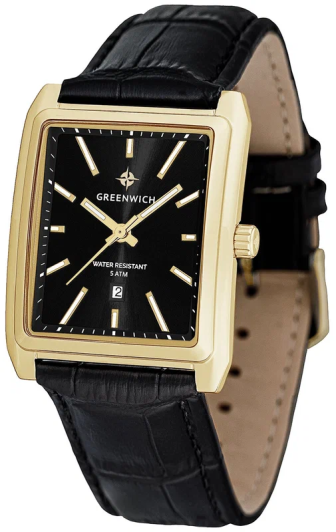 Мужские часы с минеральным стекломМинеральное стеклоМинеральное стекло представляет собой искусственно выращенный минерал кварца. Такое стекло отличается особой устойчивостью к повреждениям и царапинам. Уступает по некоторым качествам сапфировому стеклу. Greenwich Galeon GW 571.21.11, представляют собой классический вариант для повседневной носки.  Корпус часов выполнен из нержавеющей стали с PVD-покрытиемPVDУльтратонкое покрытие наносится в технике вакуумного напыления, сочетает в себе нитрид титана особой прочности со слоем золота или оксида хрома. Несёт в себе декоративную или защитную функцию.. Окошко даты находится в положении 6 часов. Стрелки с люминесцентным покрытиемЛюминесцентное покрытиеПозволяет считывать показания времени в темноте. Производители наносят на стрелки, часовые индексы, безель или поверхность циферблата светонакопительный состав, дающий холодное свечение.. Кожаный ремешок на стандартной застежке.