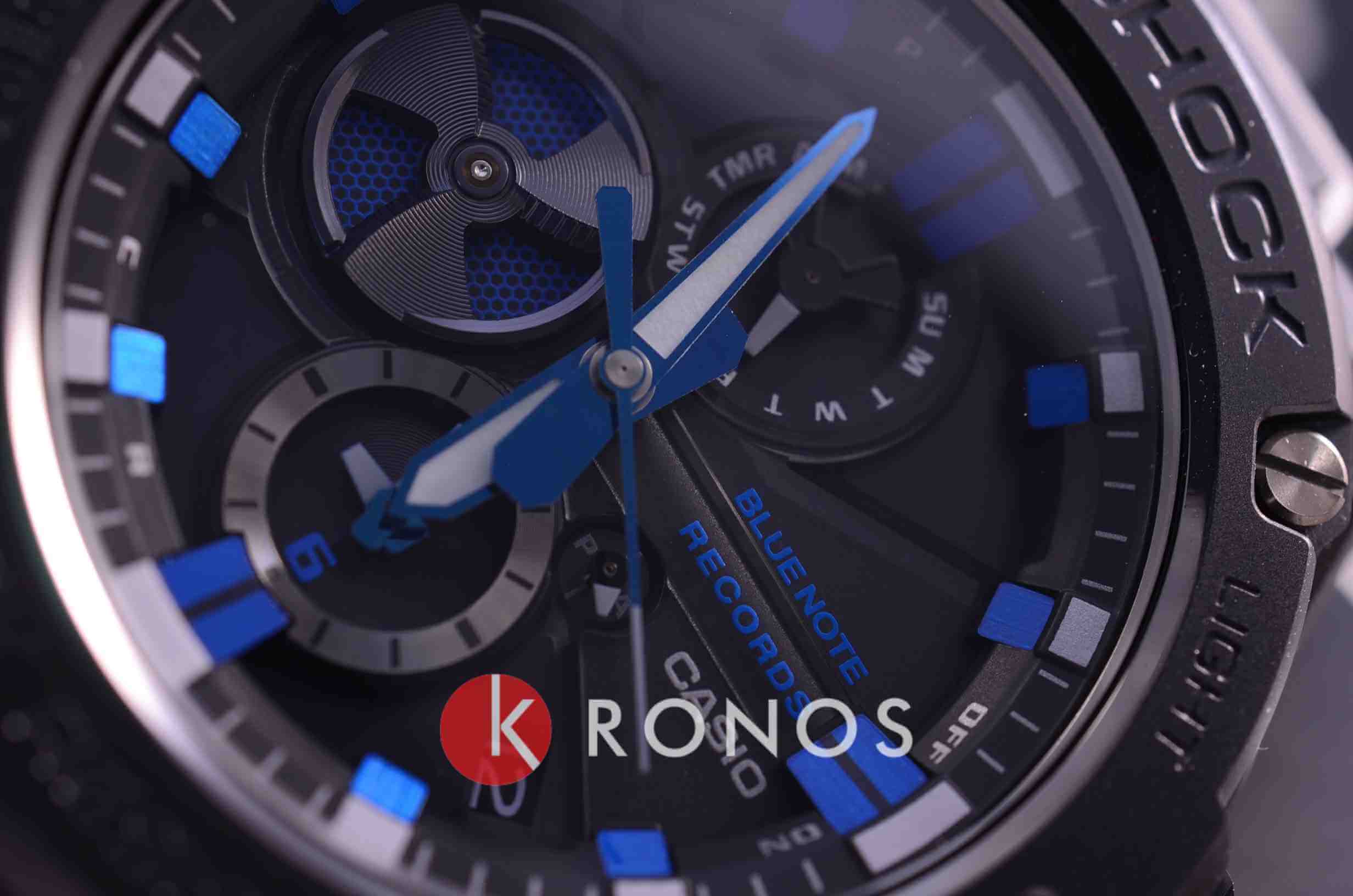 Наручные часы обладают одним из самых тонких корпусов среди стальных моделей G-Shock. Чёрное матовое исполнение имеет яркие акценты в виде синей металлической застёжки и деталей циферблата. Премиальный аксессуар особенно подойдёт тем, кто неравнодушен к оригинальным предметам и любит создавать эксклюзивные образы. Модель оснащена солнечной батарейкой - , индикатор заряда батарейки показывает состояние аккумулятора. Противоударный корпусУдаропрочный корпусМеханизм заключён в корпус, выполненный из современных материалов, устойчивых к ударам, механическим повреждениям и падению с высоты: инновационный пластик, карбон, нержавеющая сталь, титан. из пластика и нержавеющей стали 316L с IP-покрытиемIP-покрытиеМетод ионного напыления. Демонстрирует повышенную устойчивость к истиранию, окислению и химическим веществам. Под воздействием высокого давления и температуры около 1500°C молекулы металла надёжно соединяются с частицами корпуса часов.. Минеральное стекло. Задняя крышка с логотипом Blue Note Records. СветодиоднаяСветодиодная подсветкаСветодиодная или LED-подсветка обеспечивает появление яркого холодного свечения за счёт LED-элементов - маленьких лампочек. Они потребляют минимальное количество энергии, чаще всего можно встретить 1 светодиод, в нижней части циферблата. и люминесцентная подсветкаЛюминесцентное покрытиеПозволяет считывать показания времени в темноте. Производители наносят на стрелки, часовые индексы, безель или поверхность циферблата светонакопительный состав, дающий холодное свечение.. Ремешок из полимерного материала. Завинчивающаяся заводная головка. Технология BluetoothBluetoothСовременная технология, позволяющая синхронизировать часы с телефоном и переносить данные. Часы с Bluetooth расширяют возможности вашего смартфона и делают его использование ещё более удобным., секундомер, будильник, хронографХронографФункция позволяет измерять отрезки времени с особой точностью: часы, минуты, секунды. Верным признаком хронографа является наличие на циферблате 3 дополнительных окошек-счётчиков., мировое времяМировое время Полезное часовое усложнение, отображающее время в основных городах и известных областях по всему миру, оно связано с часовыми поясами, удобно для путешественников и бизнесменов. , автоматический календарь, таймер. Габариты: 58,1 x 53,8 x 14,1 мм.