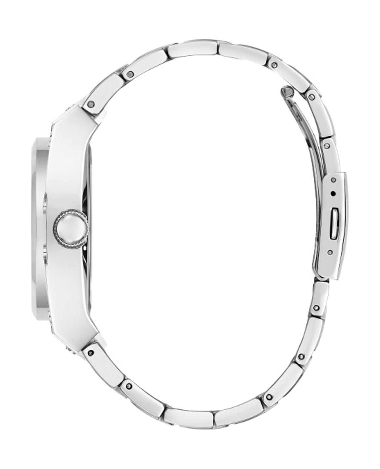Мужские наручные часы Guess Trend GW0624G1 с минеральным стекломМинеральное стеклоМинеральное стекло представляет собой искусственно выращенный минерал кварца. Такое стекло отличается особой устойчивостью к повреждениям и царапинам. Уступает по некоторым качествам сапфировому стеклу., кварцевый механизм с высокой точностью. Корпус часов изготовлен из стали. 24-х часовой формат времени, число и день недели отображаются на отдельных циферблатах. Метки в виде арабских цифр и штрихов. Стрелки и метки с люминесцентным покрытиемЛюминесцентное покрытиеПозволяет считывать показания времени в темноте. Производители наносят на стрелки, часовые индексы, безель или поверхность циферблата светонакопительный состав, дающий холодное свечение.. Рифленая заводная головка. Класс водозащиты: 50 метров, позволит защитить корпус от случайных брызг или капель дождя. Стальной браслет на раскладной застёжкеРаскладная застёжкаТакой тип застёжки используется только на браслетах из металла. Она никогда не раскрывается полностью, происходит разделение на 2 и более частей. Раскладывающая застёжка снизит вероятность потери часов к минимуму..