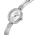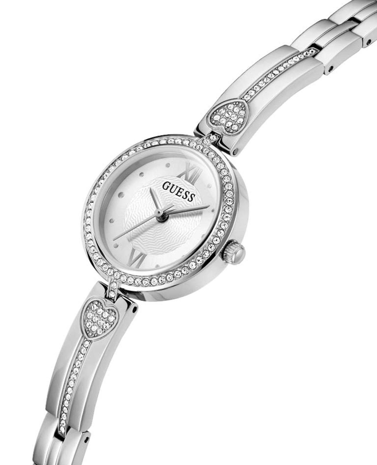Женские наручные часы с минеральным стекломМинеральное стеклоМинеральное стекло представляет собой искусственно выращенный минерал кварца. Такое стекло отличается особой устойчивостью к повреждениям и царапинам. Уступает по некоторым качествам сапфировому стеклу. Guess Dress GW0655L1 с минеральным стекломМинеральное стеклоМинеральное стекло представляет собой искусственно выращенный минерал кварца. Такое стекло отличается особой устойчивостью к повреждениям и царапинам. Уступает по некоторым качествам сапфировому стеклу., кварцевый механизм с высокой точностью. Корпус часов изготовлен из стали. БезельБезельВнешний ободок, закрепляющий стекло. В спортивных часах так называется поворотное кольцо с делениями на циферблате, выполняет роль таймера – замеряет отрезки времени на шкале. Неподвижный безель – элемент декора. Однонаправленно вращающийся безель на дайверских часах позволяет фиксировать моменты погружения и выныривания на поверхность. украшен кристаллами. Класс водозащиты: 30 метров, позволит защитить корпус от случайных брызг или капель дождя. Стальной браслет частично укарашен кристаллами на ювелирной застёжке.