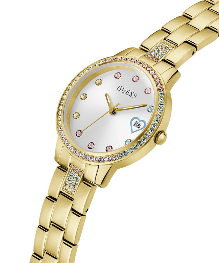 Женские наручные часы Guess Dress GW0657L2 с минеральным стекломМинеральное стеклоМинеральное стекло представляет собой искусственно выращенный минерал кварца. Такое стекло отличается особой устойчивостью к повреждениям и царапинам. Уступает по некоторым качествам сапфировому стеклу., кварцевый механизм с высокой точностью. Корпус часов изготовлен из нержавеющей стали с IP-покрытиемIP-покрытиеМетод ионного напыления. Демонстрирует повышенную устойчивость к истиранию, окислению и химическим веществам. Под воздействием высокого давления и температуры около 1500°C молекулы металла надёжно соединяются с частицами корпуса часов.. Стрелки с люминесцентным покрытиемЛюминесцентное покрытиеПозволяет считывать показания времени в темноте. Производители наносят на стрелки, часовые индексы, безель или поверхность циферблата светонакопительный состав, дающий холодное свечение.. Класс водозащиты: 30 метров, позволит защитить корпус от случайных брызг или капель дождя. Стальной браслет с IP-покрытиемIP-покрытиеМетод ионного напыления. Демонстрирует повышенную устойчивость к истиранию, окислению и химическим веществам. Под воздействием высокого давления и температуры около 1500°C молекулы металла надёжно соединяются с частицами корпуса часов. на раскладной застёжкеРаскладная застёжкаТакой тип застёжки используется только на браслетах из металла. Она никогда не раскрывается полностью, происходит разделение на 2 и более частей. Раскладывающая застёжка снизит вероятность потери часов к минимуму.. Неподвижный безельБезельВнешний ободок, закрепляющий стекло. В спортивных часах так называется поворотное кольцо с делениями на циферблате, выполняет роль таймера – замеряет отрезки времени на шкале. Неподвижный безель – элемент декора. Однонаправленно вращающийся безель на дайверских часах позволяет фиксировать моменты погружения и выныривания на поверхность. из нержавеющей стали с IP-покрытиемIP-покрытиеМетод ионного напыления. Демонстрирует повышенную устойчивость к истиранию, окислению и химическим веществам. Под воздействием высокого давления и температуры около 1500°C молекулы металла надёжно соединяются с частицами корпуса часов. украшен кристаллами.
