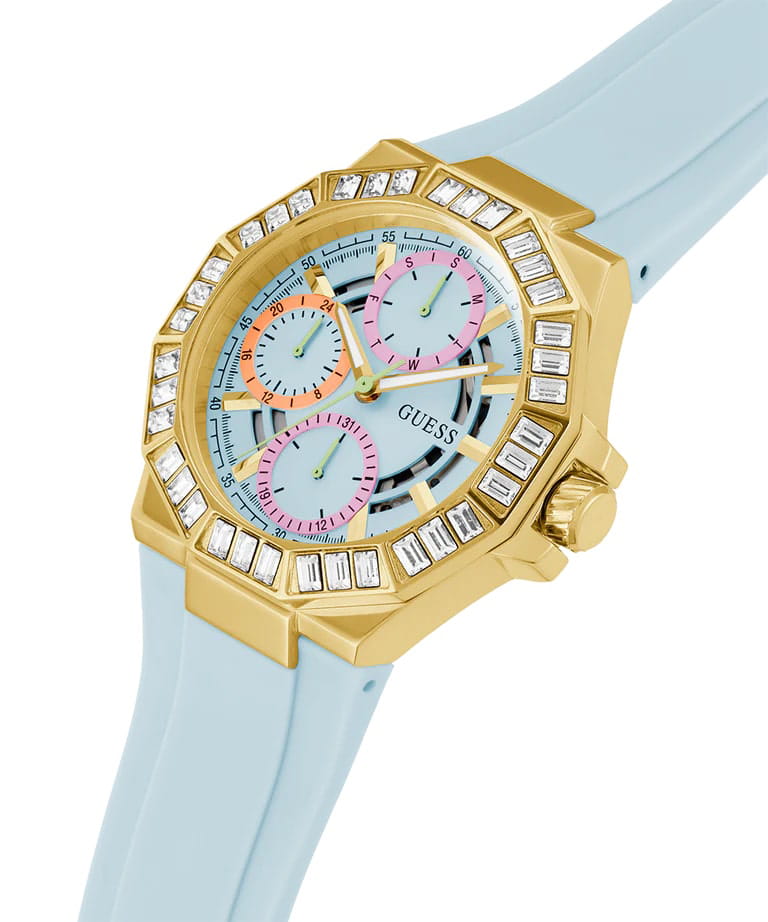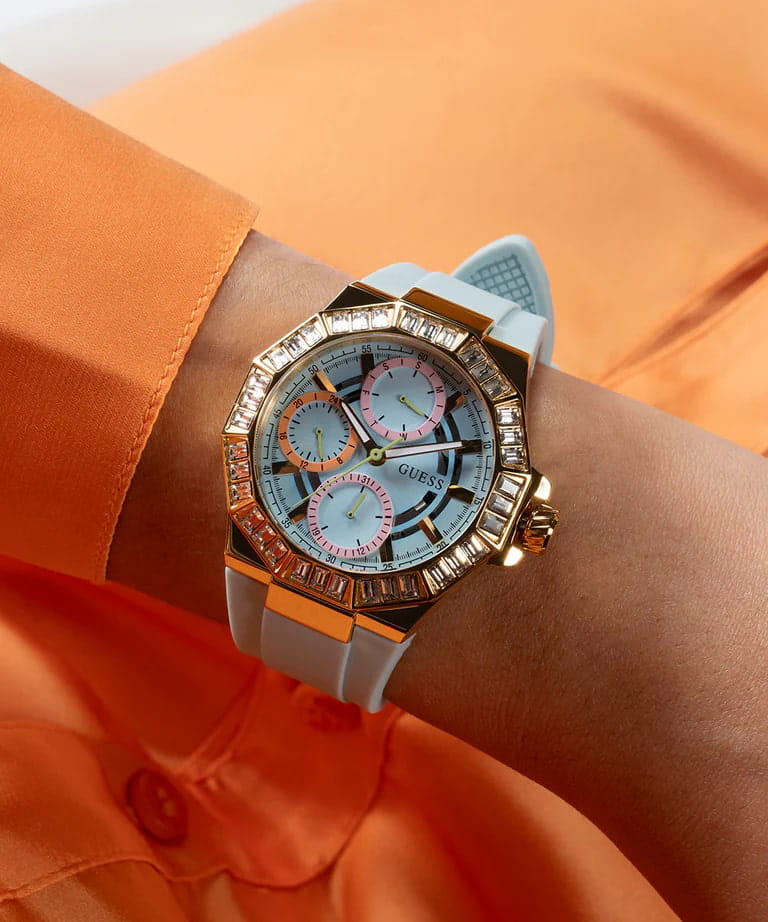 Женские наручные часы Guess GW0695L1 с минеральным стекломМинеральное стеклоМинеральное стекло представляет собой искусственно выращенный минерал кварца. Такое стекло отличается особой устойчивостью к повреждениям и царапинам. Уступает по некоторым качествам сапфировому стеклу., кварцевый механизм с высокой точностью. Корпус часов изготовлен из стали с IP-покрытиемIP-покрытиеМетод ионного напыления. Демонстрирует повышенную устойчивость к истиранию, окислению и химическим веществам. Под воздействием высокого давления и температуры около 1500°C молекулы металла надёжно соединяются с частицами корпуса часов.. Стрелки с люминесцентным покрытиемЛюминесцентное покрытиеПозволяет считывать показания времени в темноте. Производители наносят на стрелки, часовые индексы, безель или поверхность циферблата светонакопительный состав, дающий холодное свечение.. Класс водозащиты: 50 метров, позволит защитить корпус от случайных брызг или капель дождя. Силиконовый ремешок.
