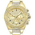 Мужские наручные часы Guess GW0899G2 – это сочетание элегантности и современного стиля. Они оснащены надежным кварцевым механизмом, который обеспечивает точность хода. Корпус часов выполнен из стали с PVD-покрытиемPVDУльтратонкое покрытие наносится в технике вакуумного напыления, сочетает в себе нитрид титана особой прочности со слоем золота или оксида хрома. Несёт в себе декоративную или защитную функцию. золотистого цвета, безельБезельВнешний ободок, закрепляющий стекло. В спортивных часах так называется поворотное кольцо с делениями на циферблате, выполняет роль таймера – замеряет отрезки времени на шкале. Неподвижный безель – элемент декора. Однонаправленно вращающийся безель на дайверских часах позволяет фиксировать моменты погружения и выныривания на поверхность. декорирован кристаллами и винтами, придающими модели особый характер. Золотистый циферблат инкрустирован кристаллами и оснащен метками в виде штрихов, что добавляет изысканности и блеска. Часы поддерживают 12-ти и 24-х часовой формат времени, а также оснащены календарем, показывающим число и день недели на отдельных циферблатах. Люминесцентное покрытиеЛюминесцентное покрытиеПозволяет считывать показания времени в темноте. Производители наносят на стрелки, часовые индексы, безель или поверхность циферблата светонакопительный состав, дающий холодное свечение. на стрелках обеспечивает отличную видимость в темноте. Стальной браслет с раскладной застежкойРаскладная застёжкаТакой тип застёжки используется только на браслетах из металла. Она никогда не раскрывается полностью, происходит разделение на 2 и более частей. Раскладывающая застёжка снизит вероятность потери часов к минимуму. гарантирует комфортное ношение и надежную фиксацию. Минеральное стеклоМинеральное стеклоМинеральное стекло представляет собой искусственно выращенный минерал кварца. Такое стекло отличается особой устойчивостью к повреждениям и царапинам. Уступает по некоторым качествам сапфировому стеклу. защищает циферблат от царапин, а водозащита 30WR предохраняет часы от случайных брызг и дождя. Эта модель станет отличным выбором для тех, кто ценит стиль и функциональность в одном аксессуаре.