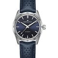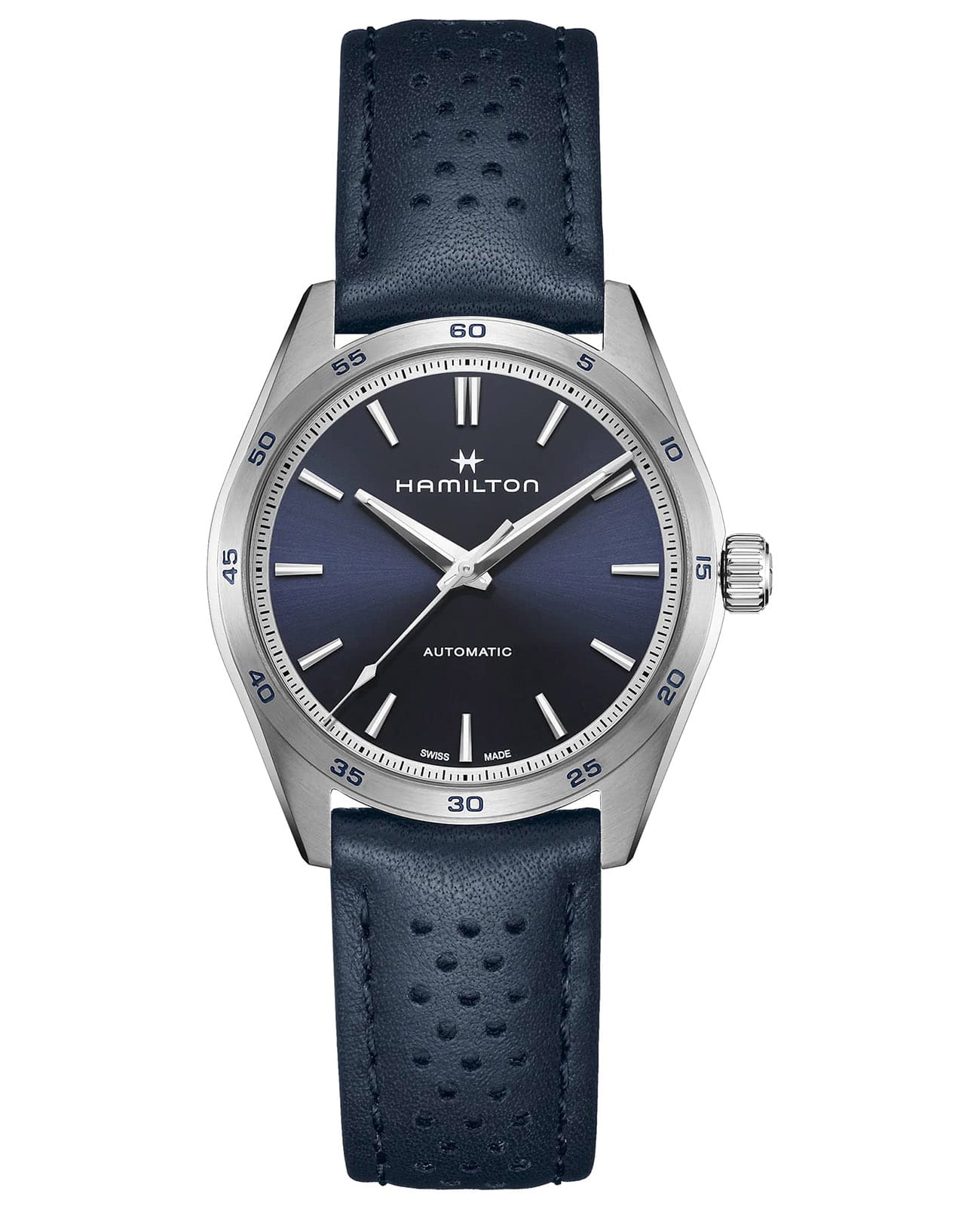 Модели из линии Jazzmaster Performer, привлекающие внимание ярким дизайном в стиле спортивный шик, сочетают в себе функциональность и эстетичность. Часы Jazzmaster Performer Automatic оснащены автоматическим механизмом H-10 с 80-часовым запасом хода. Модель в корпусе из нержавеющей стали диаметром 38 мм имеет лаконичный синий циферблат и сочетающийся с ним перфорированный синий кожаный ремешок в гоночном стиле.