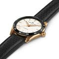 Модели из линии Jazzmaster Performer, привлекающие внимание ярким дизайном в стиле спортивный шик, сочетают в себе функциональность и эстетичность. Часы Jazzmaster Performer Automatic оснащены автоматическим механизмом H-10 с 80-часовым запасом хода. Модель в корпусе из нержавеющей стали с PVD-покрытием цвета розового золота диаметром 38 мм имеет лаконичный белый циферблат и сочетающийся с безелемБезельВнешний ободок, закрепляющий стекло. В спортивных часах так называется поворотное кольцо с делениями на циферблате, выполняет роль таймера – замеряет отрезки времени на шкале. Неподвижный безель – элемент декора. Однонаправленно вращающийся безель на дайверских часах позволяет фиксировать моменты погружения и выныривания на поверхность. перфорированный черный кожаный ремешок в гоночном стиле.
