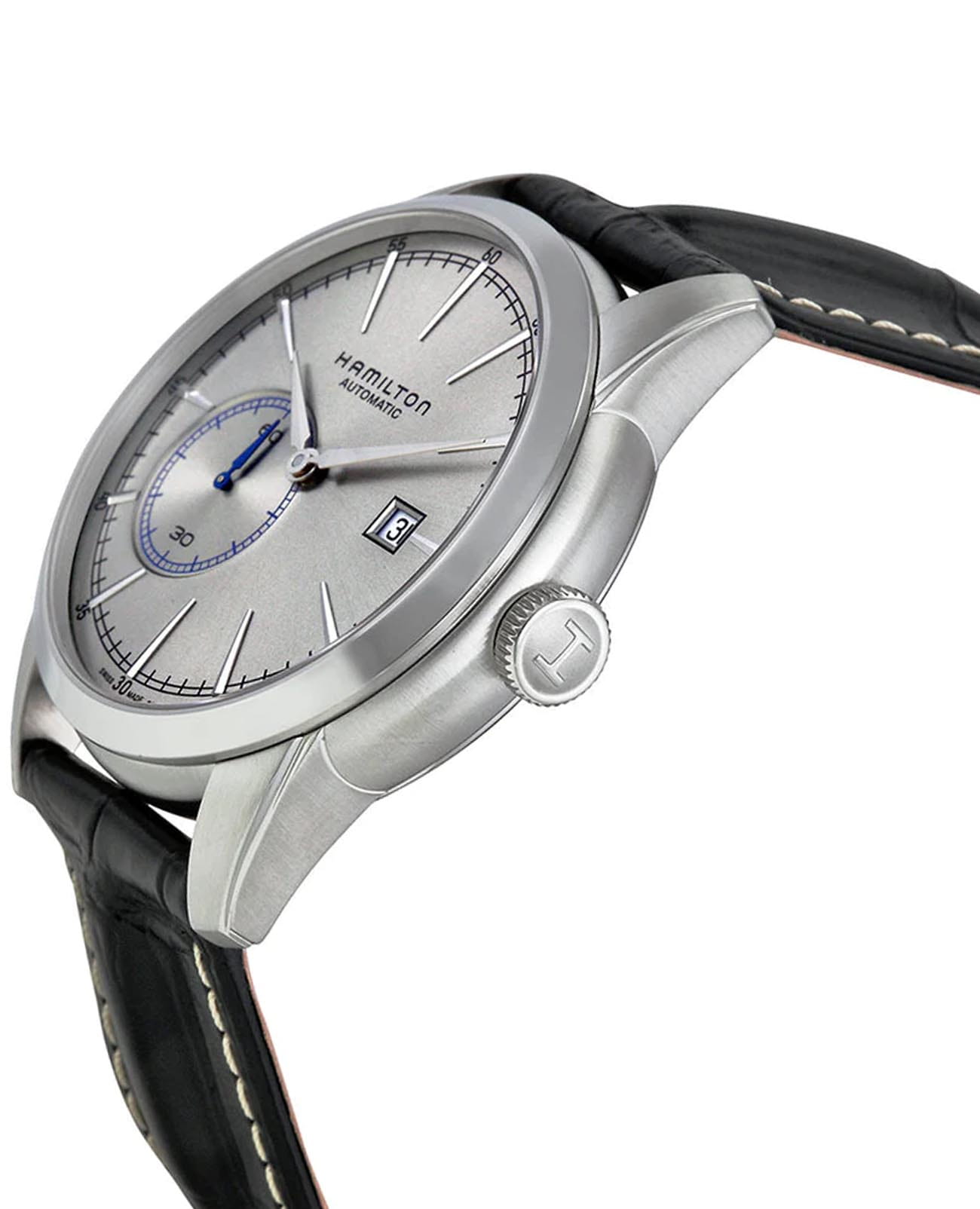Мужские швейцарские часы с автоподзаводом Hamilton American Classic Railroad Small Second Auto H40515781. Сапфировое стеклоСапфировое стеклоПрочный и надёжный материал из кристалла сапфира синтетического происхождения, характеризующийся особой твёрдостью и устойчивостью к царапинам и повреждениям. устойчивое к мелким механическим повреждениям. Корпус часов изготовлен из нержавеющей стали. Кожаный ремешок с раскладной застёжкойРаскладная застёжкаТакой тип застёжки используется только на браслетах из металла. Она никогда не раскрывается полностью, происходит разделение на 2 и более частей. Раскладывающая застёжка снизит вероятность потери часов к минимуму.. Класс водозащиты: 50 метров, позволит защитить корпус от случайных брызг или капель дождя. Окошко даты находится в положении 3 часа.