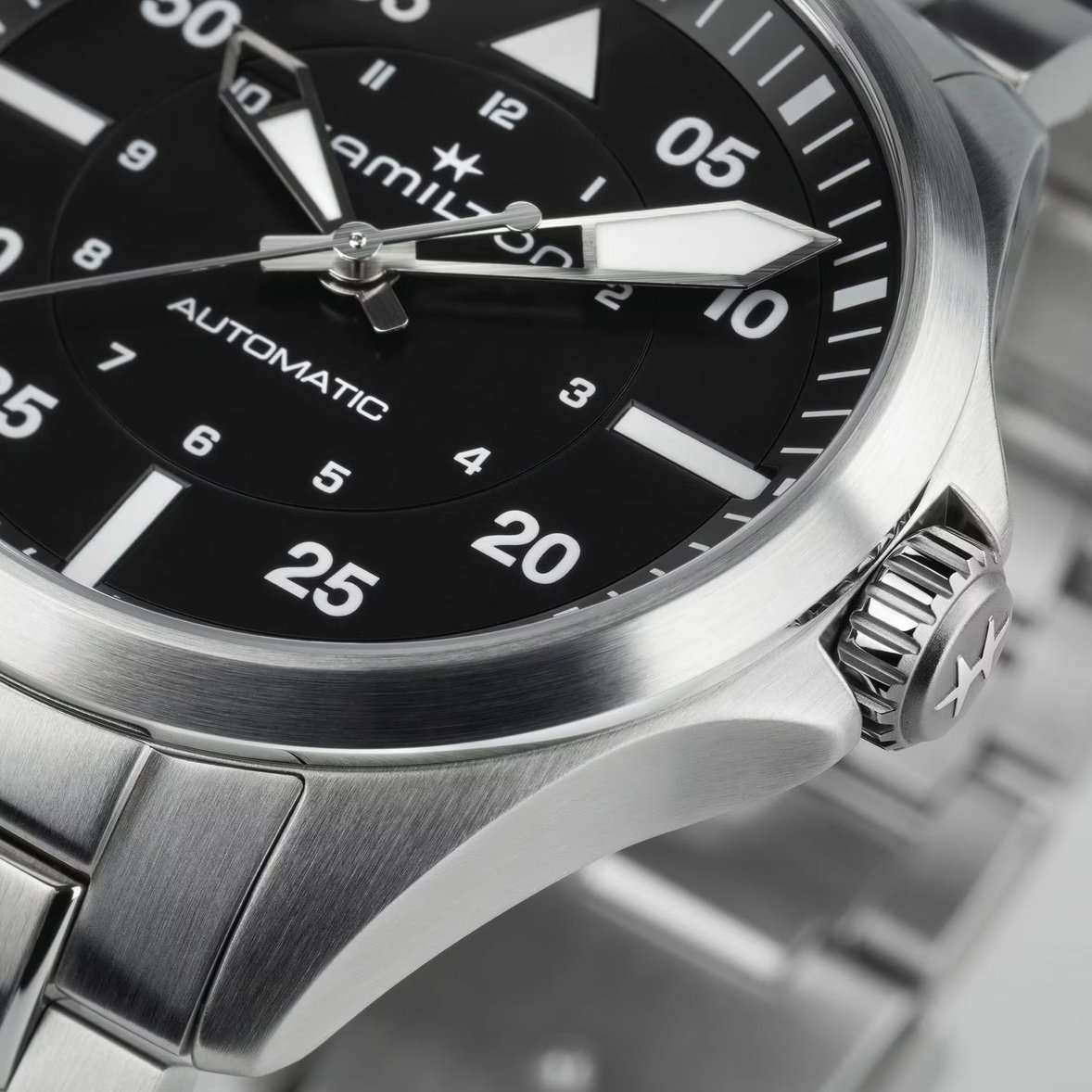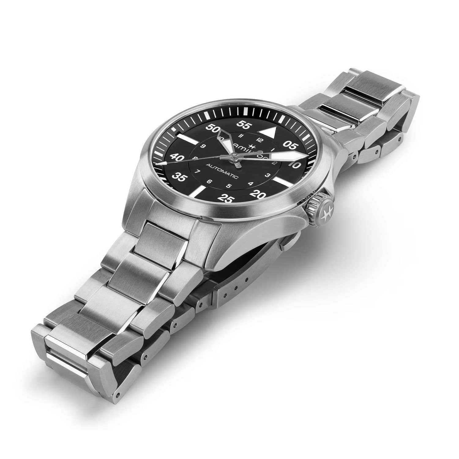 Hamilton Khaki Aviation Pilot Auto H76305130 — лаконичные и надёжные пилотские часы, вдохновлённые авиационными приборами и современными технологиями. Корпус диаметром 39 мм выполнен из нержавеющей стали с чередованием полированной и сатинированной отделки. Прозрачная задняя крышка позволяет наблюдать за работой механизма. Чёрный матовый циферблат оформлен по классике авиационного дизайна: крупные арабские цифры минутной разметки вынесены на внешний круг, а часовые метки — в центр. Стрелки и разметка покрыты люминесцентным покрытиемЛюминесцентное покрытиеПозволяет считывать показания времени в темноте. Производители наносят на стрелки, часовые индексы, безель или поверхность циферблата светонакопительный состав, дающий холодное свечение. Superluminova, что обеспечивает отличную читаемость в условиях слабого освещения. Защиту обеспечивает сапфировое стеклоСапфировое стеклоПрочный и надёжный материал из кристалла сапфира синтетического происхождения, характеризующийся особой твёрдостью и устойчивостью к царапинам и повреждениям. с антибликовым покрытиемАнтибликовое покрытиеСлой оксида металла в 0,13-0,3 микрон, благодаря которому стекло часов не бликует и не отражает свет. Антибликовое покрытие уменьшает отражение света в 10 раз, обеспечивая отличную читаемость показателей циферблата.. Внутри установлен автоматический швейцарский механизм H-10 с запасом хода до 80 часов и балансом на основе Nivachron™Nivachron™Специально разработанный инновационный сплав Nivachron™ повышает устойчивость часов к воздействию магнитных полей., устойчивым к магнитным полям. Часы укомплектованы браслетом из нержавеющей стали с раскладной застёжкойРаскладная застёжкаТакой тип застёжки используется только на браслетах из металла. Она никогда не раскрывается полностью, происходит разделение на 2 и более частей. Раскладывающая застёжка снизит вероятность потери часов к минимуму., обеспечивающей надёжную фиксацию и комфорт при носке. Водонепроницаемость 100 метров делает эту модель универсальной для повседневного ношения и активного образа жизни.