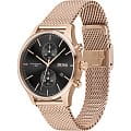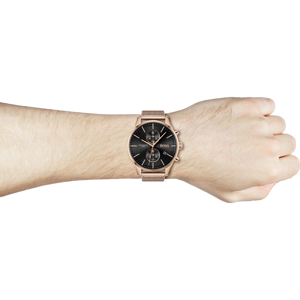 Мужские часы Hugo Boss Associate HB1513806 представлены в круглом 42-мм корпусе из нержавеющей стали 316L с золотистым PVD-покрытиемPVDУльтратонкое покрытие наносится в технике вакуумного напыления, сочетает в себе нитрид титана особой прочности со слоем золота или оксида хрома. Несёт в себе декоративную или защитную функцию.. Оснащены кварцевым механизмом с функциями хронографаХронографФункция позволяет измерять отрезки времени с особой точностью: часы, минуты, секунды. Верным признаком хронографа является наличие на циферблате 3 дополнительных окошек-счётчиков., секундомеромСекундомерСекундоме́р — прибор, способный измерять интервалы времени с точностью до долей секунды. и индикацией даты на позиции 4 часа. Циферблат с подсветкой стрелок защищен устойчивым к царапинам минеральным стекломМинеральное стеклоМинеральное стекло представляет собой искусственно выращенный минерал кварца. Такое стекло отличается особой устойчивостью к повреждениям и царапинам. Уступает по некоторым качествам сапфировому стеклу.. Стальной браслет дополнен раскладной застёжкойРаскладная застёжкаТакой тип застёжки используется только на браслетах из металла. Она никогда не раскрывается полностью, происходит разделение на 2 и более частей. Раскладывающая застёжка снизит вероятность потери часов к минимуму. с фиксатором для надежной посадки. Водонепроницаемость 50 метров (5 ATM) обеспечивает защиту от брызг и дождя.