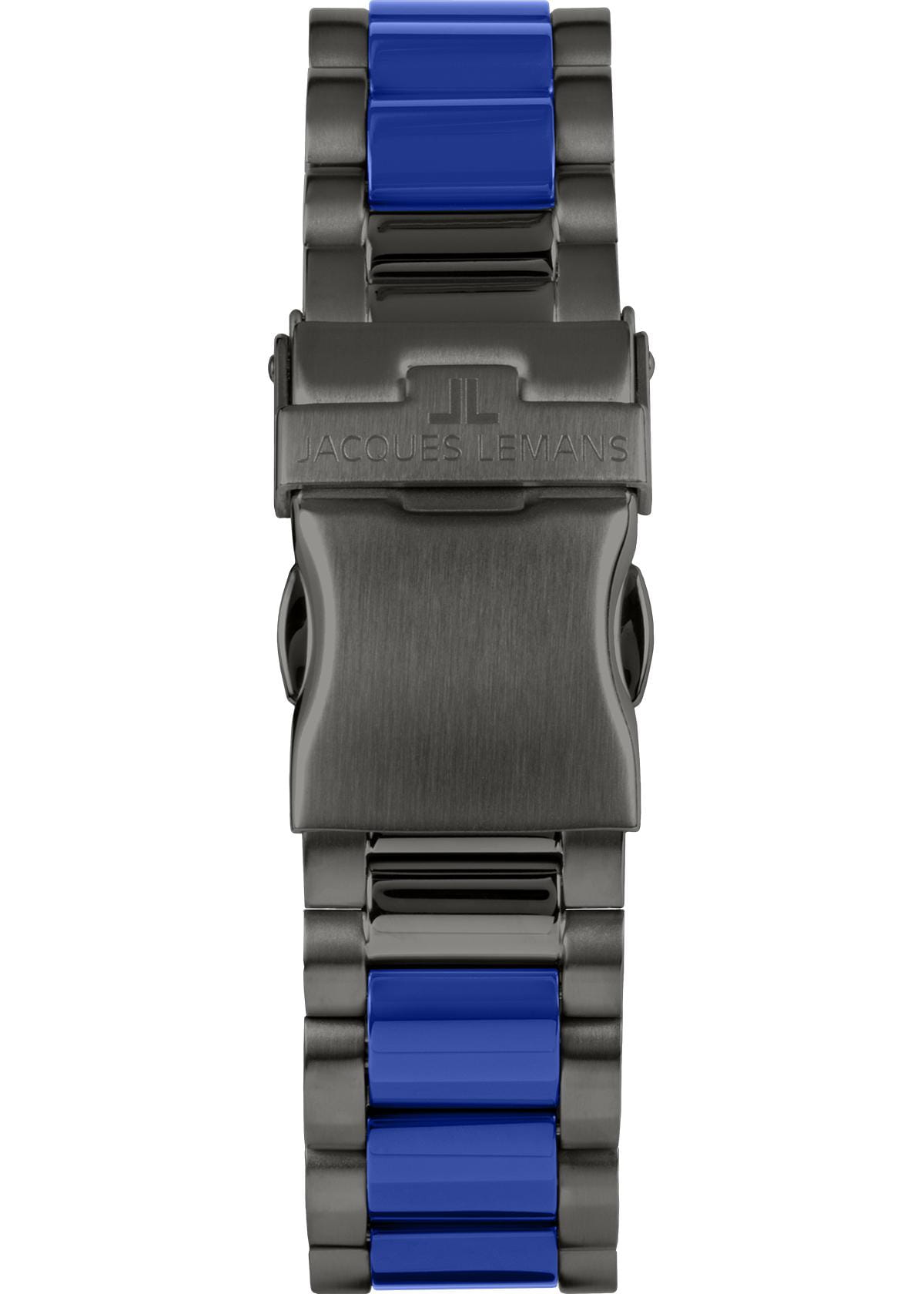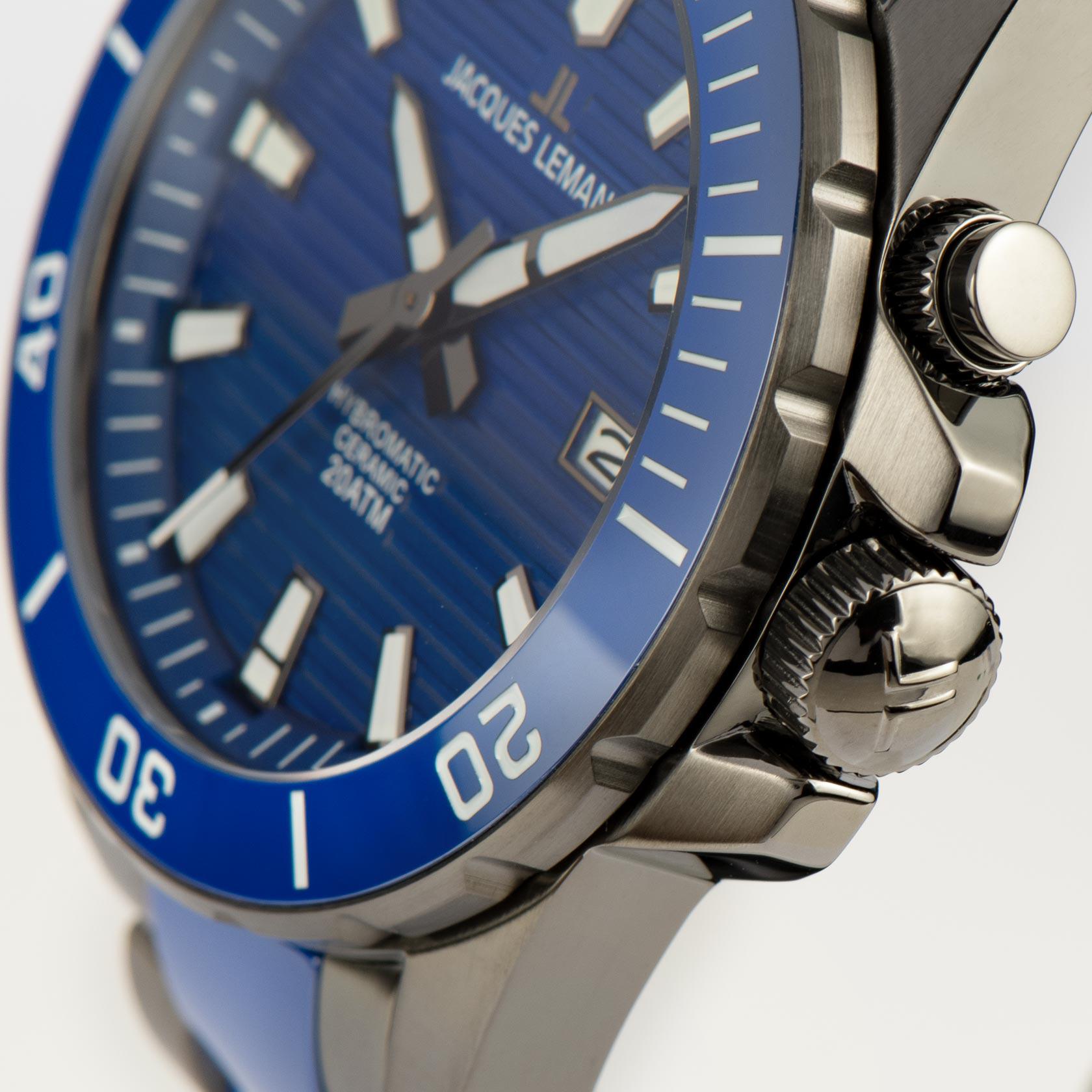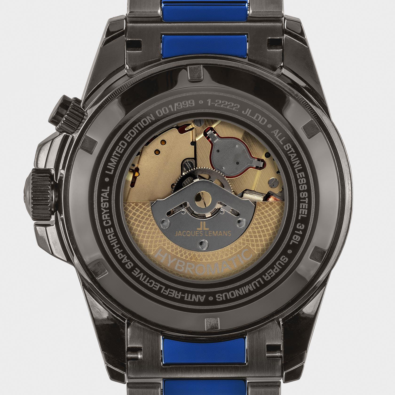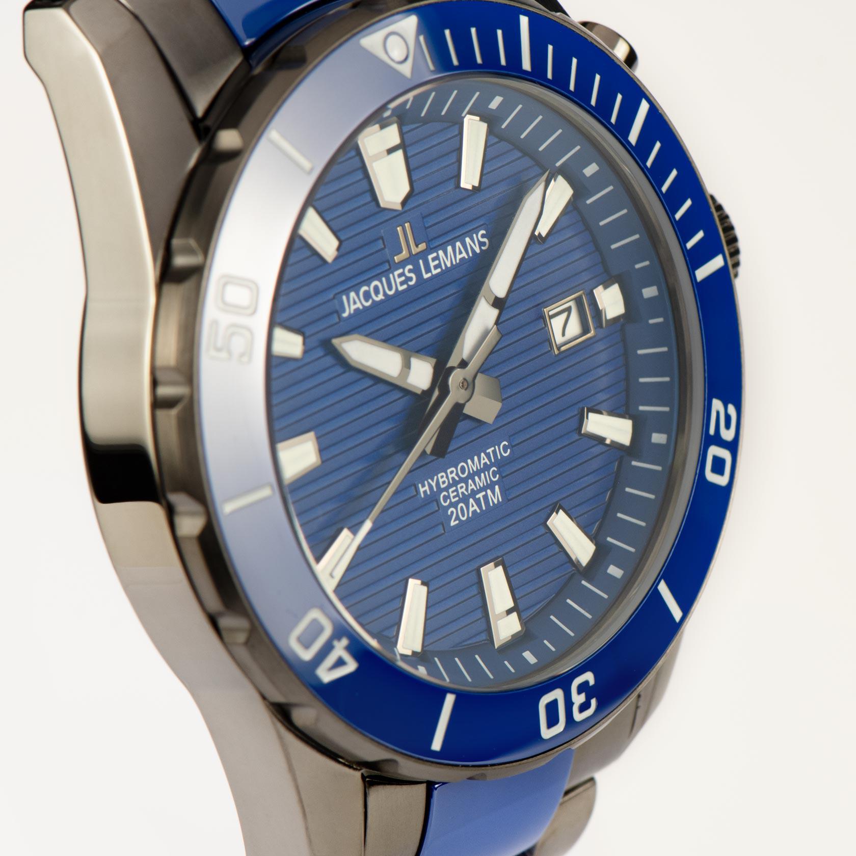 Мужские часы Jacques Lemans Venice 1-2222C с сапфировым стекломСапфировое стеклоПрочный и надёжный материал из кристалла сапфира синтетического происхождения, характеризующийся особой твёрдостью и устойчивостью к царапинам и повреждениям., гибрид кварца и механики с автоподзаводом. Лимитированная серия революционных часов Hybromatic: всего выпущено 999 штук каждой модели. Вращающийся безельБезельВнешний ободок, закрепляющий стекло. В спортивных часах так называется поворотное кольцо с делениями на циферблате, выполняет роль таймера – замеряет отрезки времени на шкале. Неподвижный безель – элемент декора. Однонаправленно вращающийся безель на дайверских часах позволяет фиксировать моменты погружения и выныривания на поверхность. из нержавеющей стали с PVDPVDУльтратонкое покрытие наносится в технике вакуумного напыления, сочетает в себе нитрид титана особой прочности со слоем золота или оксида хрома. Несёт в себе декоративную или защитную функцию. покрытием. Стрелки и метки с люминесцентным покрытиемЛюминесцентное покрытиеПозволяет считывать показания времени в темноте. Производители наносят на стрелки, часовые индексы, безель или поверхность циферблата светонакопительный состав, дающий холодное свечение.. Окошко даты расположено в позиции «3 часа». Класс водозащиты: 200 метров, позволит плавать, нырять и заниматься другими водными видами спорта. Прозрачная задняя крышка позволит в подробностях разглядеть необычный механизм. Браслет из нержавеющей стали с PVDPVDУльтратонкое покрытие наносится в технике вакуумного напыления, сочетает в себе нитрид титана особой прочности со слоем золота или оксида хрома. Несёт в себе декоративную или защитную функцию. покрытием и высокотехнологичной керамикиВысокотехнологичная керамикаИнновационный запатентованный Rado материал с гладкой или матовой поверхностью. Керамика за счёт кристаллической структуры обладает повышенной устойчивостью от возникновения царапин. Материал способен принимать температуру тела человека, обеспечивая невероятный комфорт при ношении. на раскладной застёжкеРаскладная застёжкаТакой тип застёжки используется только на браслетах из металла. Она никогда не раскрывается полностью, происходит разделение на 2 и более частей. Раскладывающая застёжка снизит вероятность потери часов к минимуму..