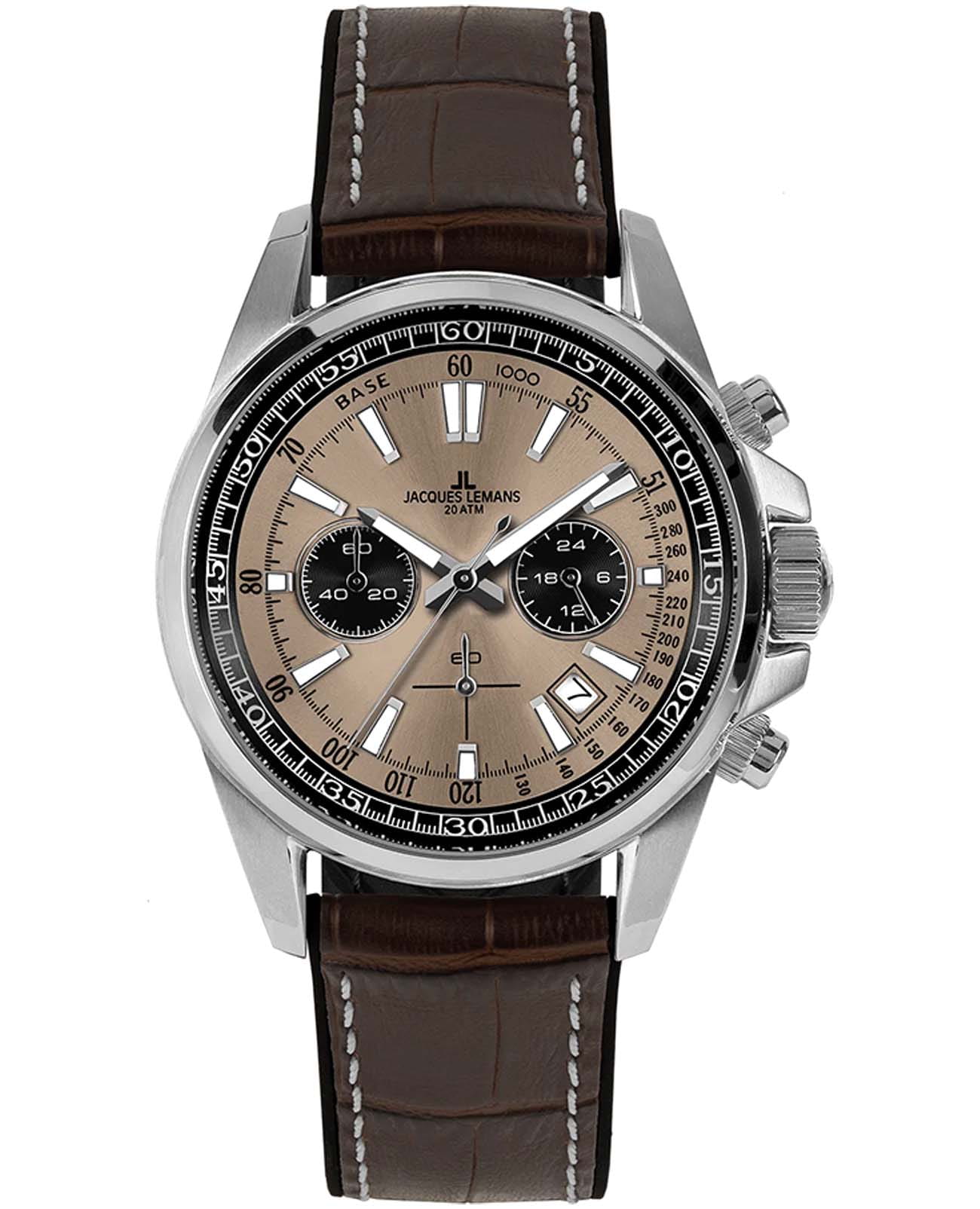 Мужские часы Jacques Lemans Liverpool 1-2117ZF представляют собой стильный хронографХронографФункция позволяет измерять отрезки времени с особой точностью: часы, минуты, секунды. Верным признаком хронографа является наличие на циферблате 3 дополнительных окошек-счётчиков., отражающий идеальное сочетание современного дизайна, надёжности и функциональности. Элегантный облик позволяют носить часы как со строгой рубашкой, так и с повседневными джинсами. Корпус из нержавеющей стали диаметром 44 мм идеально сбалансирован и элегантен. Ударопрочное минеральное стеклоМинеральное стеклоМинеральное стекло представляет собой искусственно выращенный минерал кварца. Такое стекло отличается особой устойчивостью к повреждениям и царапинам. Уступает по некоторым качествам сапфировому стеклу. Crystex защищает циферблат от царапин. Комбинированный кожаный ремешок (верхняя часть сделана из натуральной кожи коричневого цвета, внутренняя часть — из силикона) на стандартной застёжке обеспечивает комфортное ношение. Водозащита 200 метров позволит плавать, нырять и заниматься другими водными видами спорта. Стрелки и метки с люминесцентным покрытиемЛюминесцентное покрытиеПозволяет считывать показания времени в темноте. Производители наносят на стрелки, часовые индексы, безель или поверхность циферблата светонакопительный состав, дающий холодное свечение. позволяющие легко определять время даже в темноте. Хорошо читаются дополнительные индикаторы 24-х часов, счетчики минут и секунд. Окошко даты находится в положении между 4 и 5 часов. Это аксессуар для мужчины, который ценит классический стиль и функциональность.