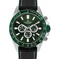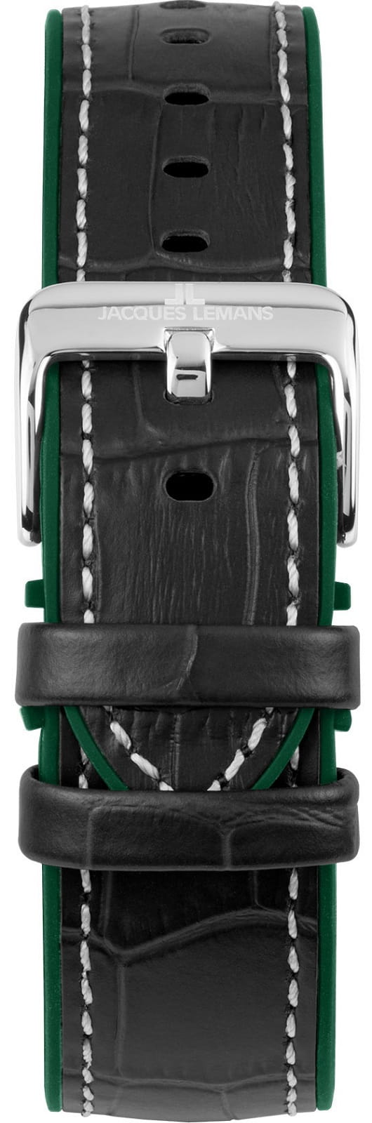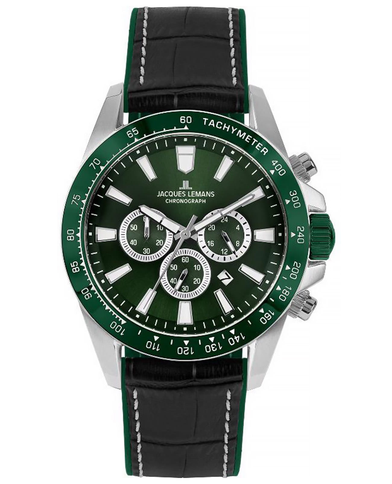 Кварцевый хронографХронографФункция позволяет измерять отрезки времени с особой точностью: часы, минуты, секунды. Верным признаком хронографа является наличие на циферблате 3 дополнительных окошек-счётчиков. в мощном корпусе диаметром 48 мм. Нержавеющая сталь, из которой он сделан, отличается гипоаллергенными свойствами и стойкостью к коррозии. Широкий контрастный безельБезельВнешний ободок, закрепляющий стекло. В спортивных часах так называется поворотное кольцо с делениями на циферблате, выполняет роль таймера – замеряет отрезки времени на шкале. Неподвижный безель – элемент декора. Однонаправленно вращающийся безель на дайверских часах позволяет фиксировать моменты погружения и выныривания на поверхность. с тахиметрической шкалой обрамляет зеленый циферблат. На нем расположены три дополнительных индикатора и окошко даты. С помощью индикаторов можно засекать временные промежутки (секунды и минуты) и определять время в 24-часовом формате времяисчисления. В модели установлено минеральное стеклоМинеральное стеклоМинеральное стекло представляет собой искусственно выращенный минерал кварца. Такое стекло отличается особой устойчивостью к повреждениям и царапинам. Уступает по некоторым качествам сапфировому стеклу.. Повышенная водостойкость равна 10 атмосфер. Ремешок выполнен из натуральной кожи черного цвета с прошивкой, застежка украшена логотипом бренда. Часы Jacques Lemans, надежные и функциональные, хорошо дополнят образ в спортивном или повседневном стиле.