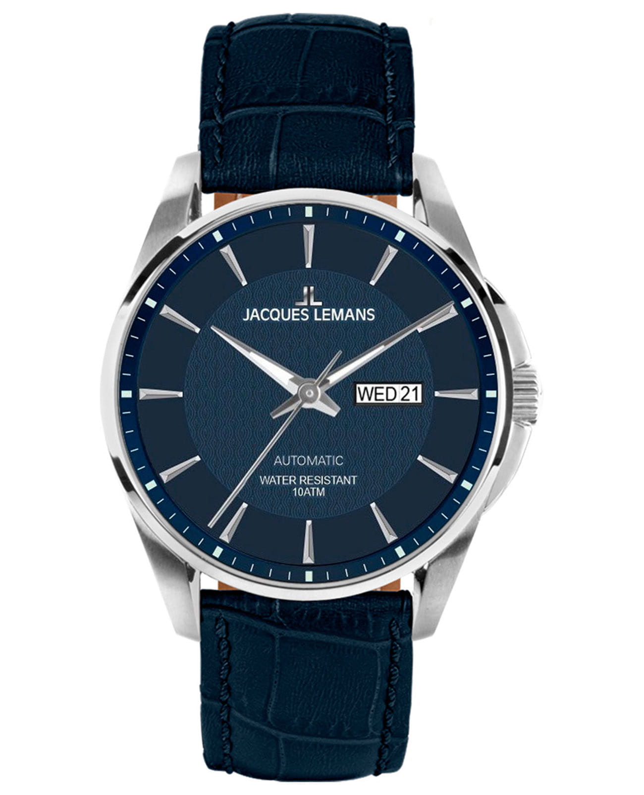 Мужские механические часы с автоподзаводом Jacques Lemans Classic 1-2154B. Минеральное стеклоМинеральное стеклоМинеральное стекло представляет собой искусственно выращенный минерал кварца. Такое стекло отличается особой устойчивостью к повреждениям и царапинам. Уступает по некоторым качествам сапфировому стеклу. устойчивое к появлению царапин, обладающее высокой прозрачностью. Класс водозащиты: 100 метров, позволит плавать, нырять и заниматься другими водными видами спорта. Корпус часов изготовлен из нержавеющей стали. На циферблате окошко даты находится в положении 3 часа. Стрелки с люминесцентным покрытиемЛюминесцентное покрытиеПозволяет считывать показания времени в темноте. Производители наносят на стрелки, часовые индексы, безель или поверхность циферблата светонакопительный состав, дающий холодное свечение.. Ремешок из натуральной кожи на стандартной застежке.